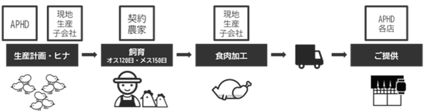 自社ヒナセンターにて孵化したヒナを、現地契約農家が育成。それを株式会社エー・ピーホールディングスが買い取り、自社センターで加工してお店に届けます。通常ならこの過程で何社も介すところを、株式会社エー・ピーホールディングスは2006年から一貫で対応する仕組みを構築し、おいしく価値ある地鶏を安価に提供することができています。