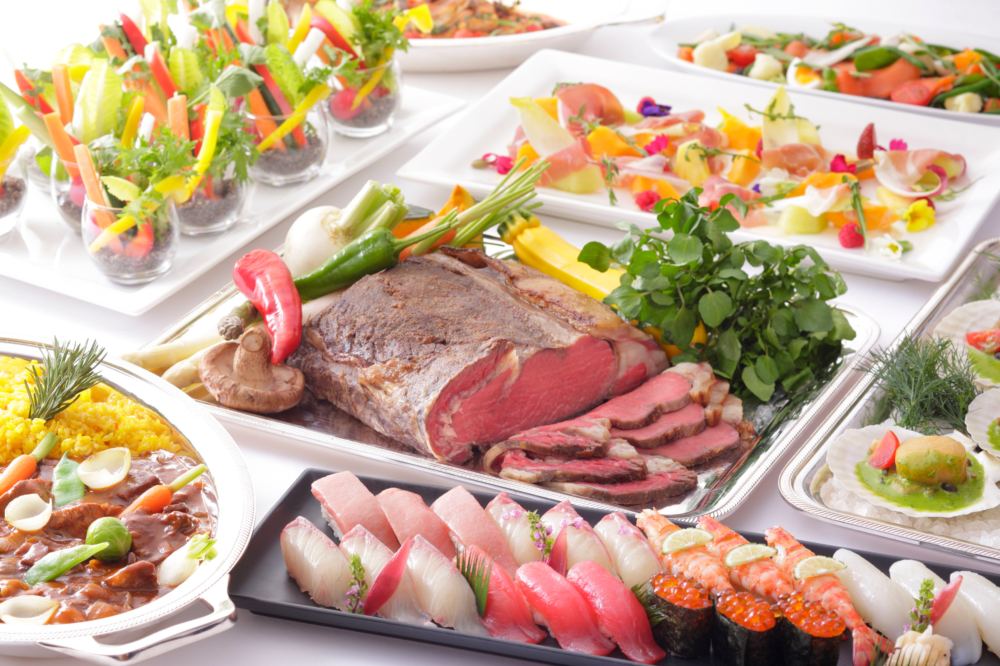 お料理は、どの世代の方でも満足していただけるよう和食から洋食、スイーツまでバラエティ豊かなメニューを取り揃え、お好みの料理を自由に選べるバイキング形式でご用意します。お子様が楽しめるケーキのデコレーション体験コーナーや、シェフが目の前で料理を仕上げるお寿司や鉄板焼き、パスタ等が登場するライブキッチンコーナーもご用意します。