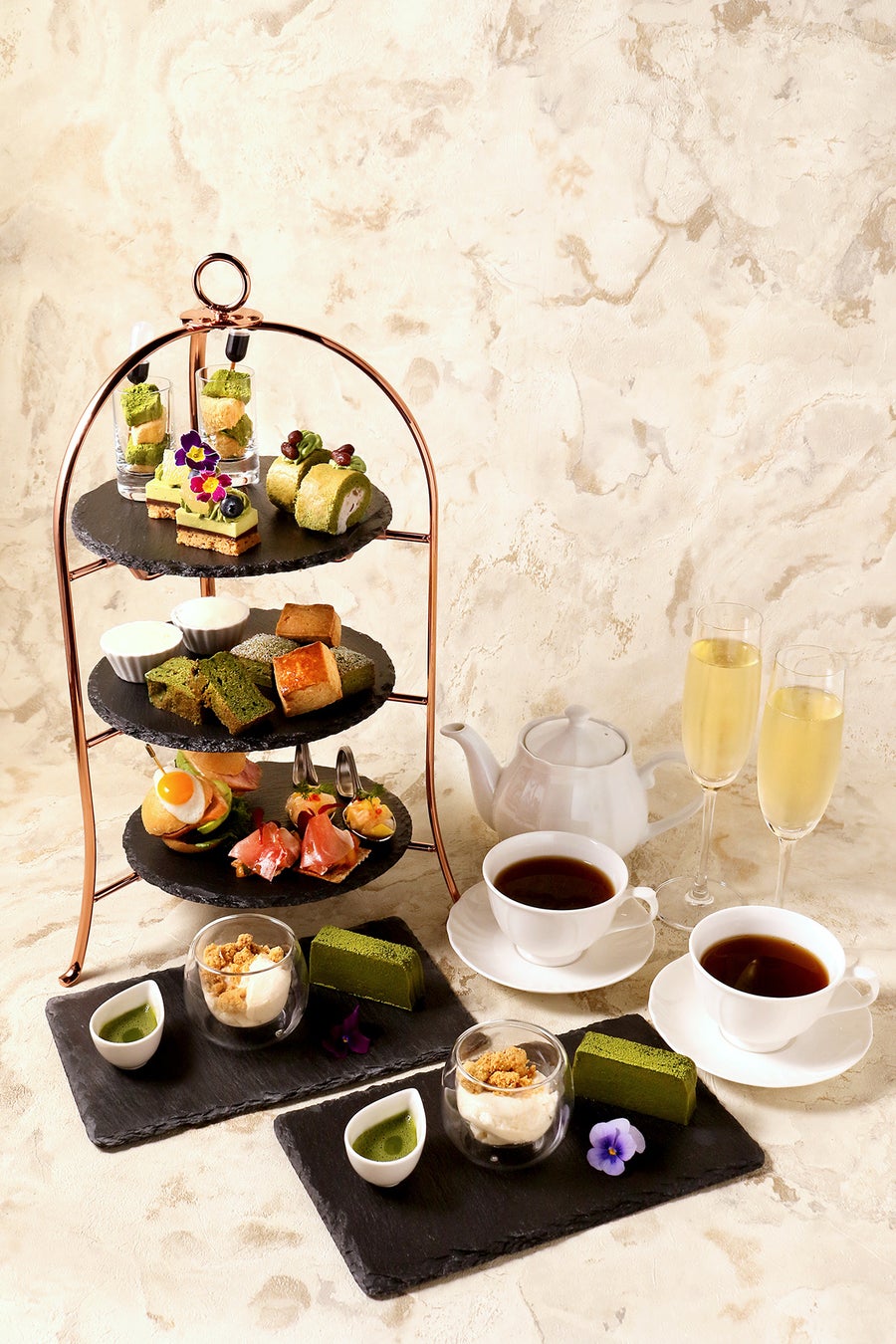 タワー1段目は、2種のわらびもち(ヴェルジョワーズ*の黒蜜付)、抹茶レアチーズタルト、抹茶ロールケーキ・小倉クリーム。さまざまな触感の抹茶スイーツが楽しめます。
