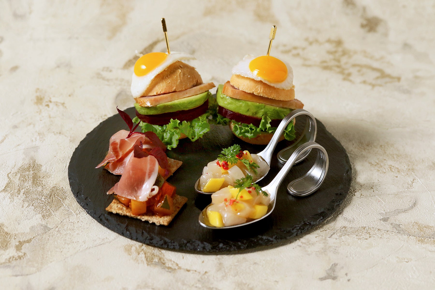 タワー3段目のお食事メニューにもこだわりました。彩り野菜のラタトゥイユはクラッカーにのせて食べやすく仕上げました。ホタテとマンゴーのタルタルは気分を変えるのにぴったり。てっぺんの目玉焼きが目を惹く鴨とビーツとアボガドのミニバーガーは小ぶりながらも食べ応え充分です!