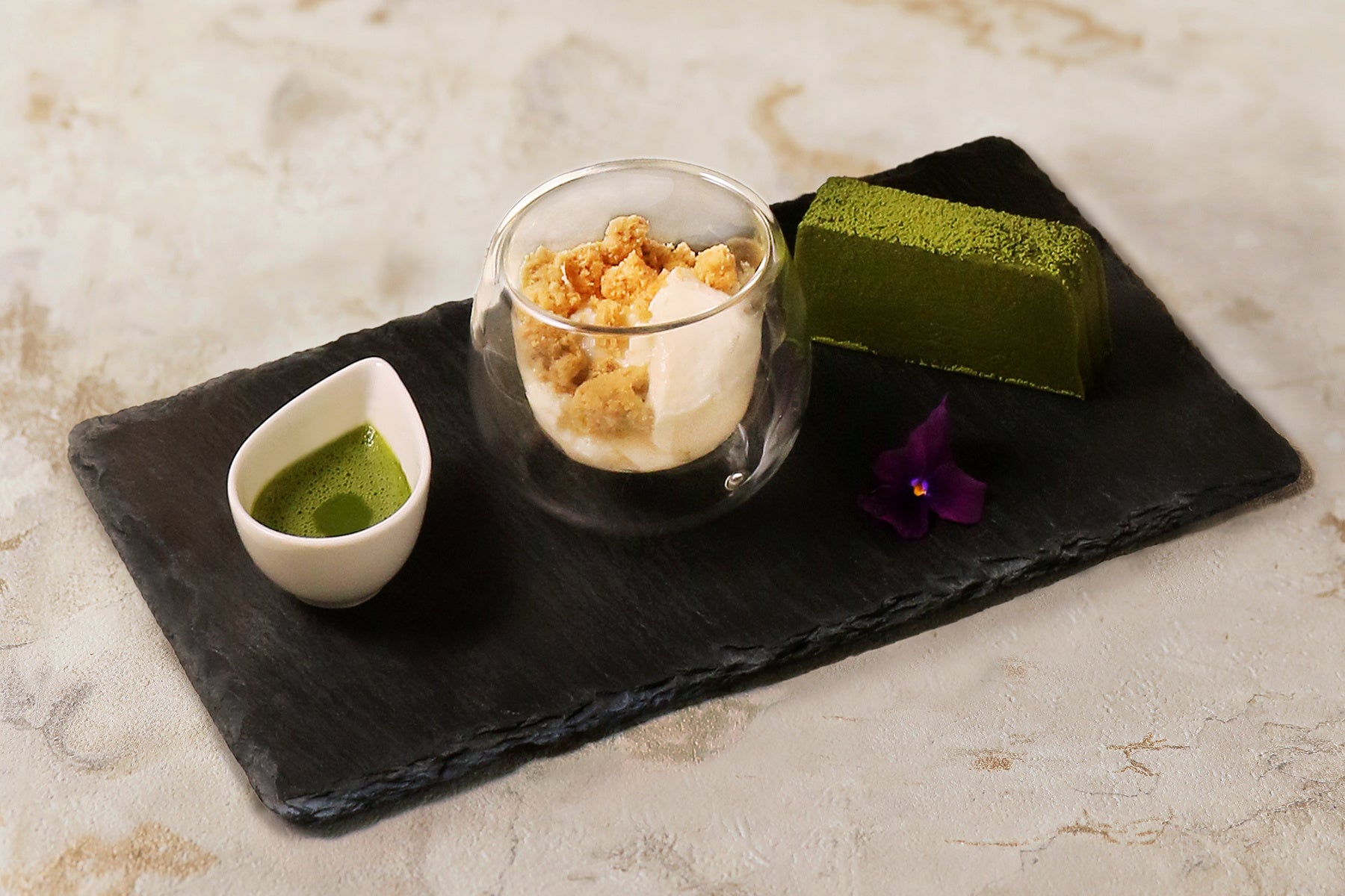 濃厚な抹茶テリーヌと白胡麻ブランマンジェをご用意いたしました。