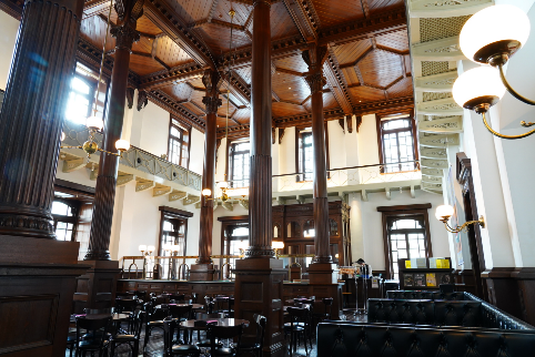 明治期(1894年)に銀行営業室として利用された空間を復元したミュージアムカフェ・バー。クラシックな趣と、2層吹き抜けの高い天井が人気のお店です。