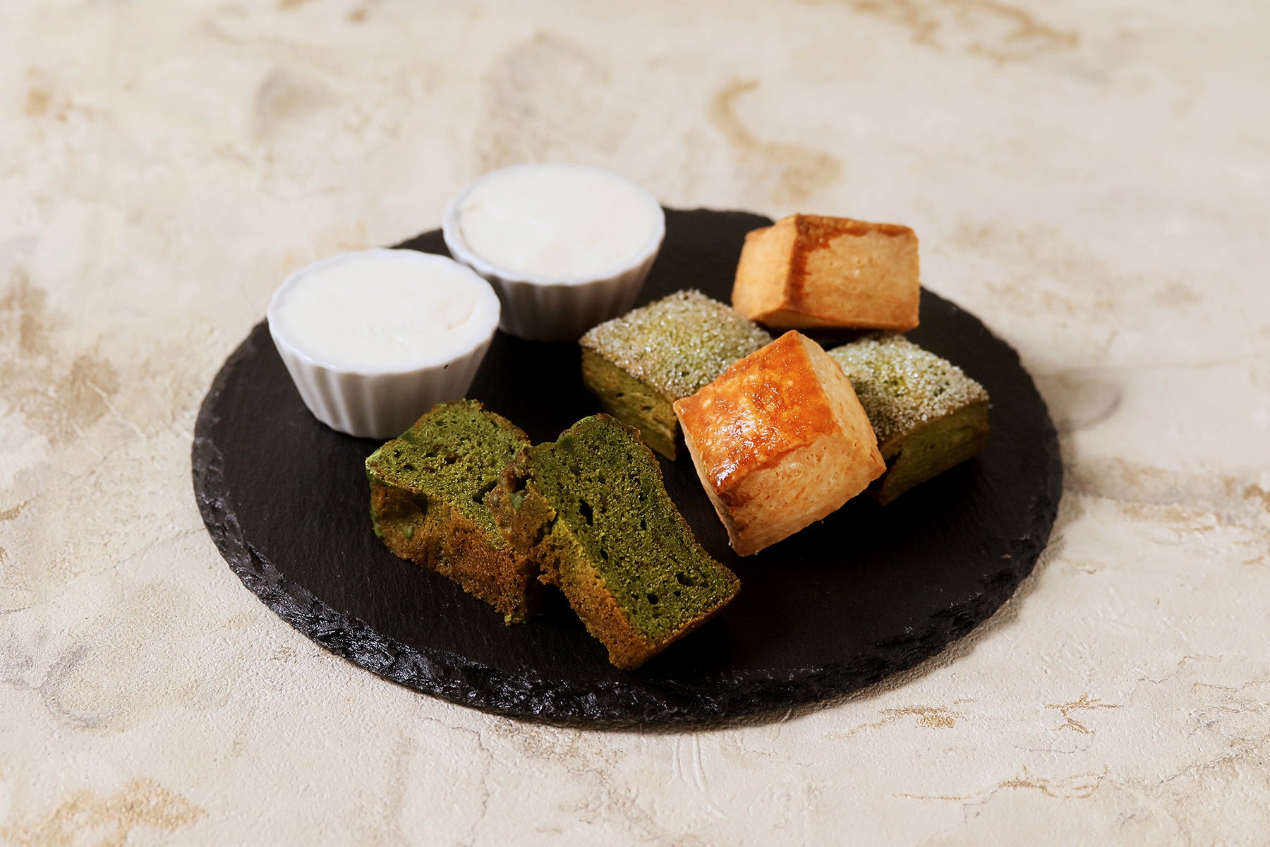 タワー2段目は、アフタヌーンティーの王道の一品。プレーン、抹茶とホワイトチョコチップスコーンをご準備しました。クロテッドクリームをつけて召し上がりください。英国発祥のパウンドケーキも抹茶味に。