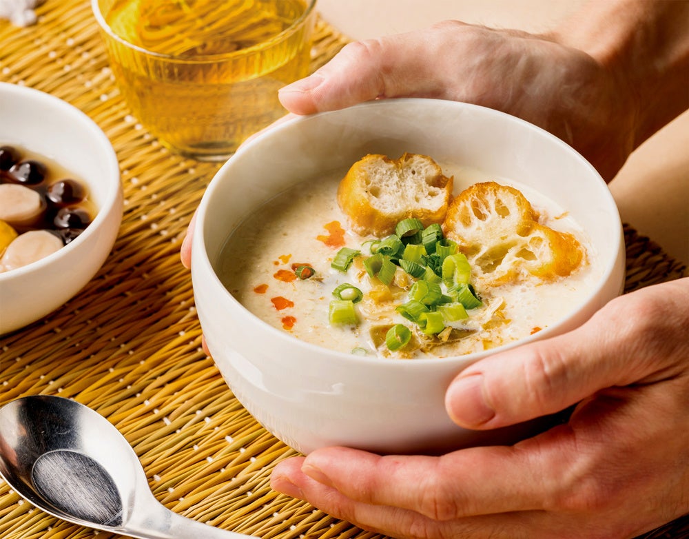 台湾の伝統的な朝食である鹹豆漿(シェンドウジャン)とは、あたたかい豆乳に、お酢を入れることでゆるく固めた豆乳スープ。朝食にはもちろん、昼食や夕方の少し小腹がすいた時などにもぴったりな軽食です。