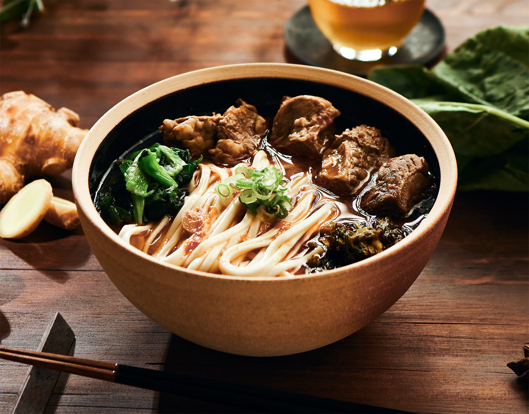 柔らかく煮込んだ牛肉を乗せた台湾人のソウルフード。旨味の溶け出したスープと特製麺の相性は抜群!