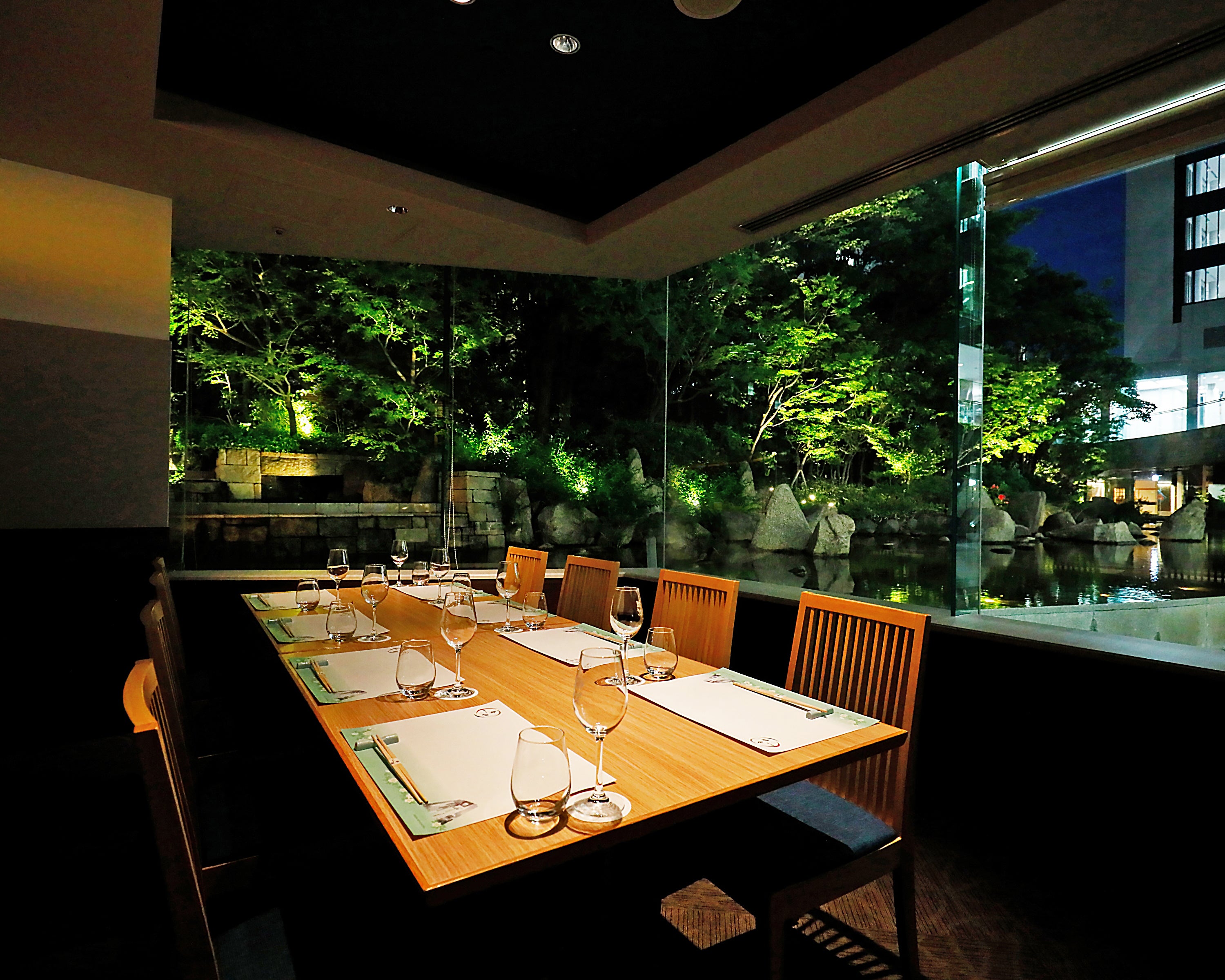 窓の外には、水面を渡る風にキラキラと輝く新芽の鮮やかな緑が広がる落ち着いた雰囲気の個室やテーブル席をご用意。
