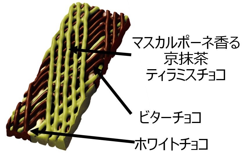 - 京都産の宇治抹茶とマスカルポーネチーズを合わせた抹茶ティラミスチョコに、ビターチョコ、ホワイトチョコが折り重なった上質な味わいです。