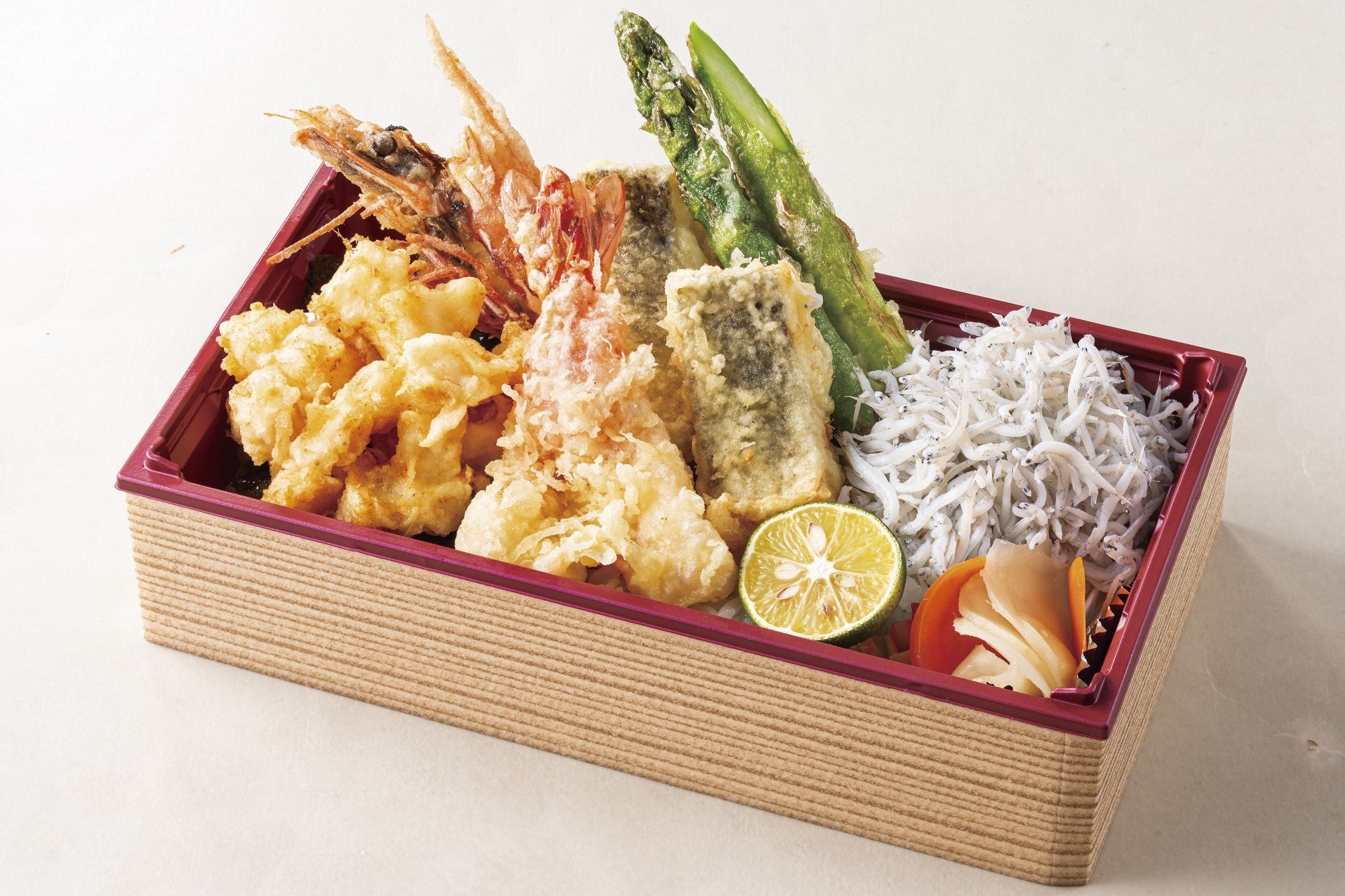 「鱸としらすの塩天丼」は、店内飲食だけでなくお弁当としてテイクアウトも可能です。