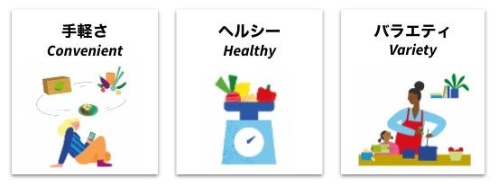 新しい料理を発見する楽しさ、レシピを考える手間や買物の時間を省き、計量済みの食材のみお届けする手軽さにもこだわりました。平均9種類の材料を組み合わせた、ヘルシーで楽しいおうちごはんを実現します。お客様の注文を起点として食材を調達するビジネスモデルであるため、食品ロスも削減できます。