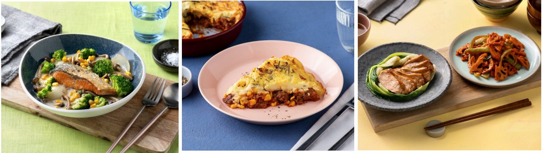 バラエティ豊かなレシピが毎週10種類更新され、定番・ファミリー・低カロリーのプランにあったメニューが自動的に届きます。また、お好みのメニューをカスタマイズすることも可能です。ミールキットが届いたら、6ステップのレシピに従って、簡単に楽しく料理ができます。サービスの内容は順次拡大を予定しています。