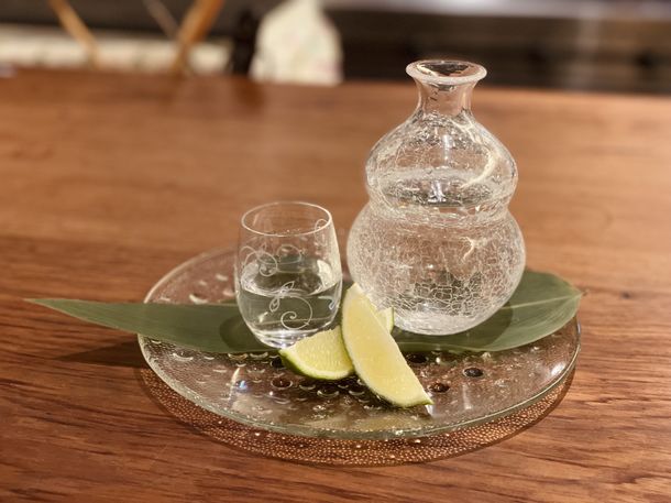 はたしょうの日本酒に氷とすだちをいれてお楽しみください。