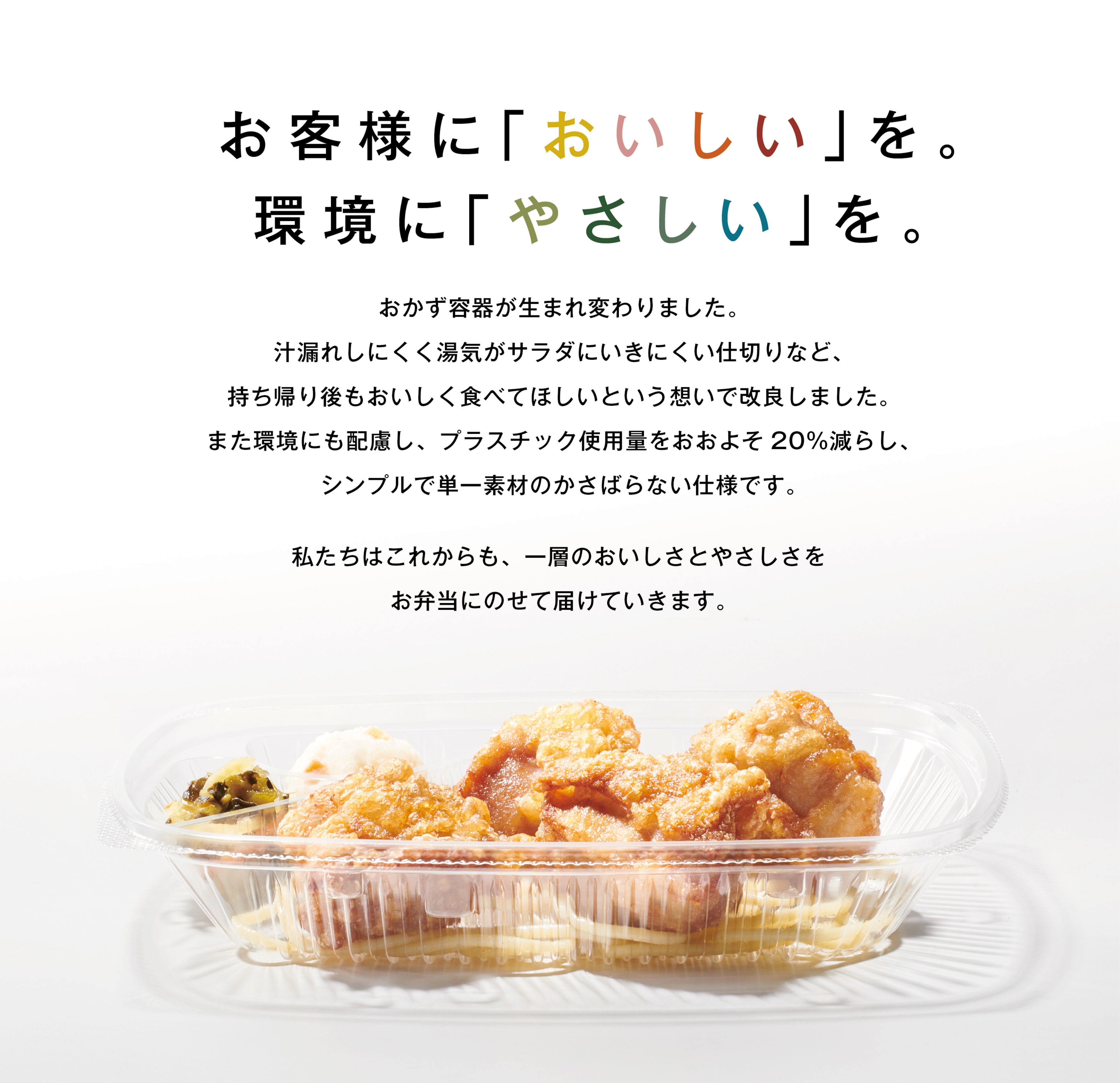 新しい『おかず容器』は、汁漏れしにくく湯気がサラダにいきにくい仕切りなど、持ち帰り後もおいしく食べてほしいという想いで改良しました。また環境にも配慮し、プラスチック使用量を約20%減らし、シンプルで単一素材のかさばらない仕様です。