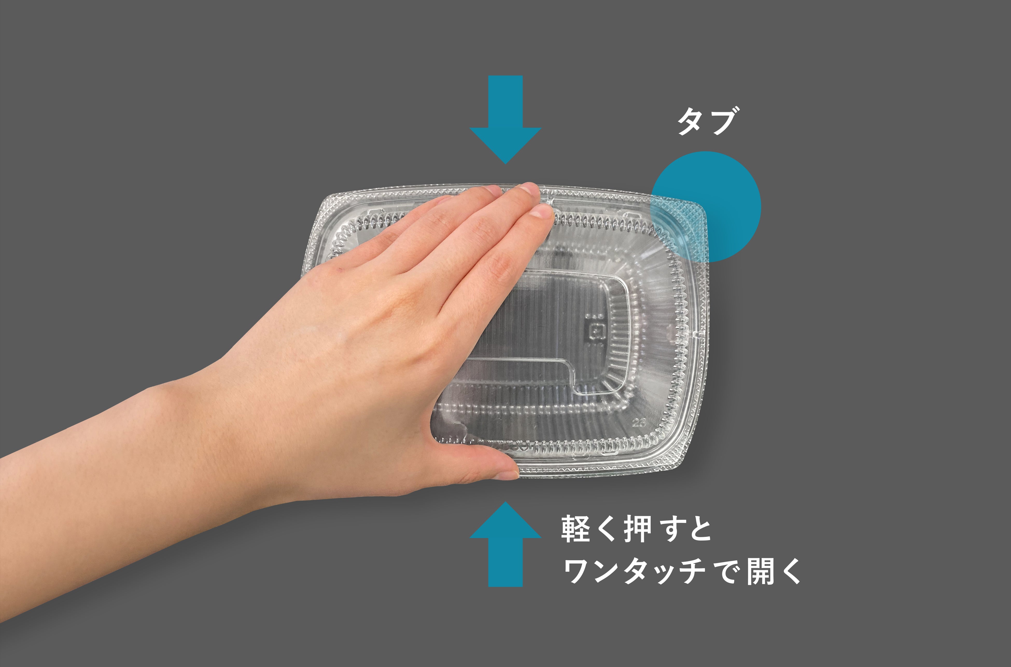 内勘合で汁漏れしにくい構造ながら、フタがあけやすい人にやさしい容器を目指し、タブをつけるだけでなく、真ん中のくぼみを押すとワンタッチで開く構造に改良しました。