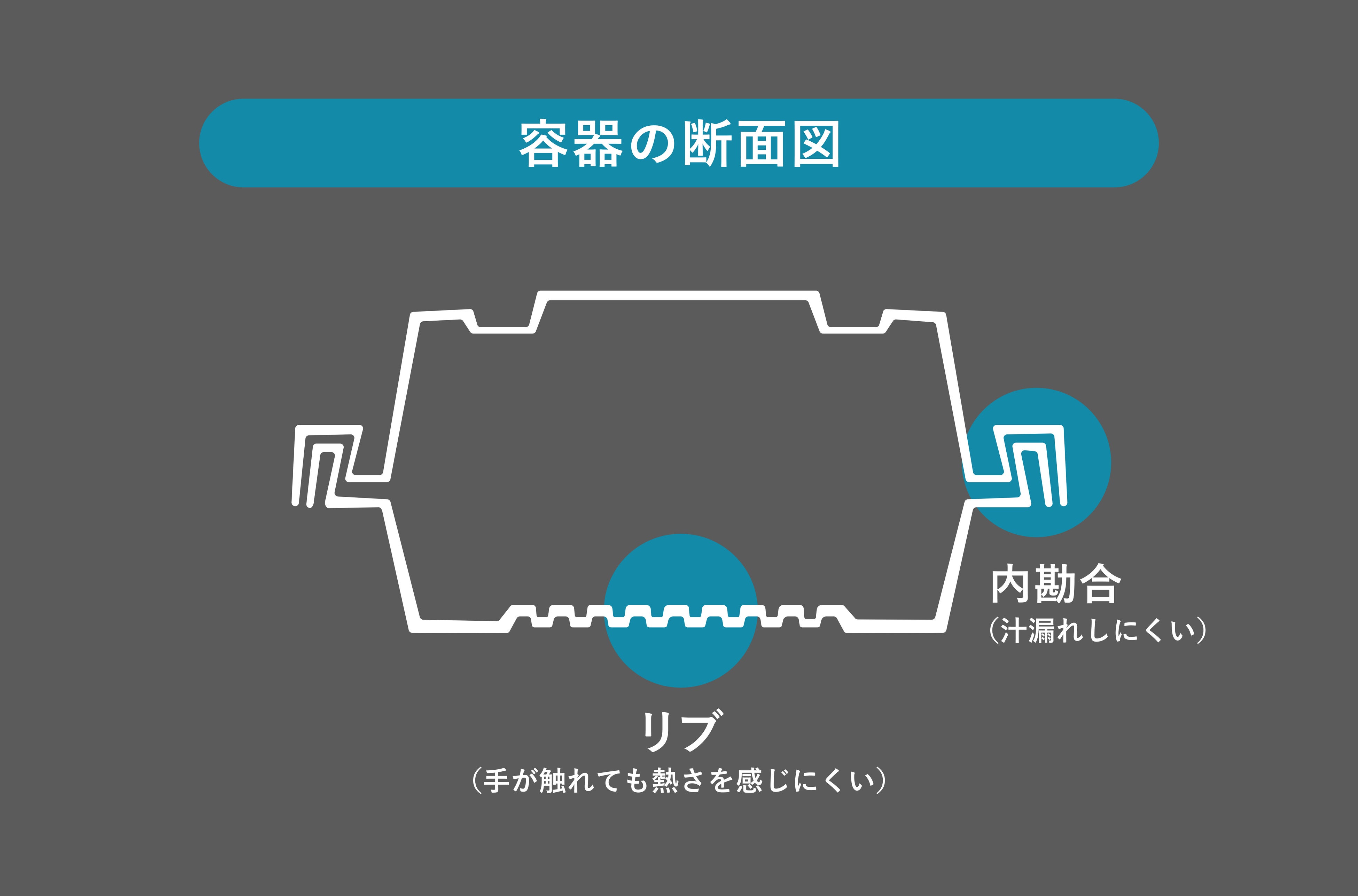 シェアデリの増加により、お弁当を持ち運ぶ距離や負荷の拡大を受け、お弁当の中のソースなどが外にこぼれないよう、汁漏れしにくい内勘合に変更いたしました。また容器の至るところにリブを入れ、手に持った時に熱さを感じにくい構造に改良しました。