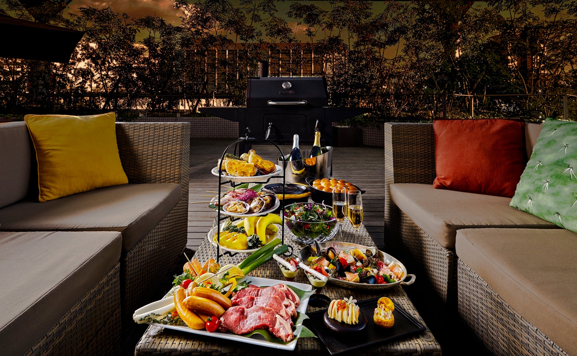 「アゴーラBBQテラス2022」では、毎年ご好評いただく牛サーロインをはじめ、チキンコンフィやフランクフルト、魚介、野菜などの数々の食材を、炭火で焼き上げる本格グリルBBQをご提供します。当ホテルならではの料理長が監修したフレンチベースのお料理を、前菜からデザートまでコース仕立てで味わえます。コロナ禍で生活様式の変化におけるストレスなどからも開放し、皆がリラックスしてお過ごしいただけるよう、風通しの良いオープンテラスをゆったりとしたテーブル配置にし、安心安全に配慮しながら最大150分間滞在いただけるスタイルで、本格的なバーベキューをご堪能いただけます。