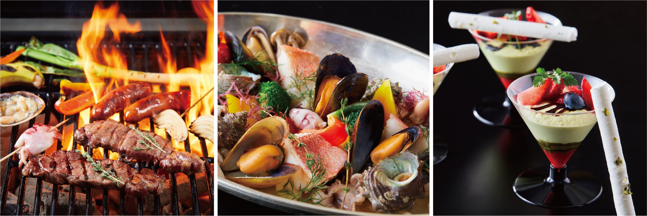「アゴーラBBQテラス2022」では、毎年ご好評いただく牛サーロインをはじめ、チキンコンフィやフランクフルト、魚介、野菜などの数々の食材を、炭火で焼き上げる本格グリルBBQをご提供します。当ホテルならではの料理長が監修したフレンチベースのお料理を、前菜からデザートまでコース仕立てで味わえます。コロナ禍で生活様式の変化におけるストレスなどからも開放し、皆がリラックスしてお過ごしいただけるよう、風通しの良いオープンテラスをゆったりとしたテーブル配置にし、安心安全に配慮しながら最大150分間滞在いただけるスタイルで、本格的なバーベキューをご堪能いただけます。