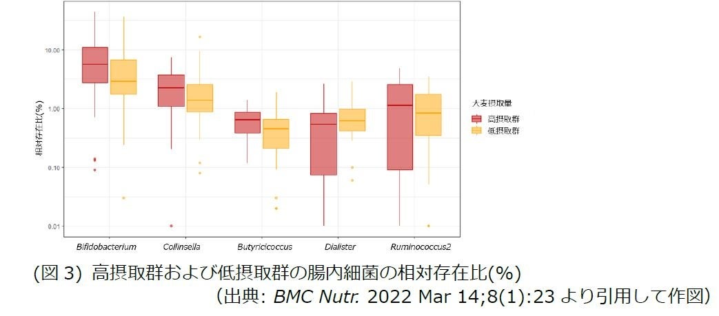 高摂取群では、Bifidobacterium、Collinsella、Butyricicoccus、Dialister、Ruminococcus 2の相対存在比(%)が低摂取群と比べてFDR調整(5)前の比較で有意に高い結果となりました。(図3)