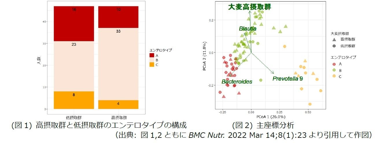 解析対象者94名をA:Bacteroides型、B:Blautia型、C:Prevotella型の3つのエンテロタイプに分類しました。(図1) 高摂取群ではAが10名、Bが33名、Cが4名、低摂取群ではAが16名、Bが23名、Cが8名となりましたが、両群間に有意差はありませんでした。しかしながら、主座標分析(4)においてPCoA2軸の正の方向に高摂取群、負の方向に低摂取群が分布する傾向が見られました。(図2)