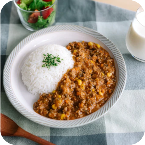 細かく刻んである野菜やきのこ類で自然に食物繊維やビタミンをとることも期待できるメニューです。お子さんが痩せている場合は好きなものやカロリーのとれるメニューを中心に食べることがおすすめ。カレー粉など香りある食材で食欲のアップする効果も期待できます。