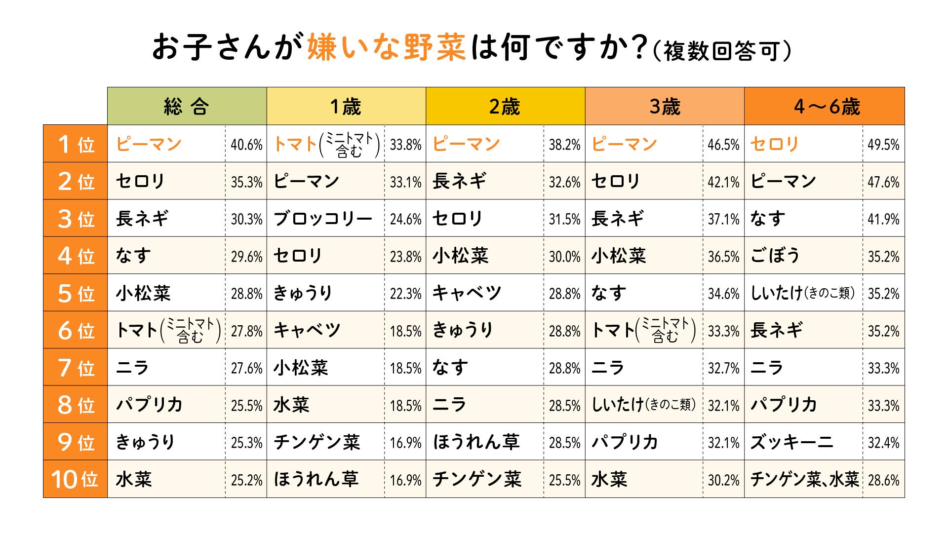 逆に「お子さんの嫌いな野菜」について尋ねました。1歳児では、好きな野菜5位にランクインしていた「トマト(ミニトマト含む)」が嫌いな野菜1位に。2歳児・3歳児は「ピーマン」、4~6歳児は「セロリ」という結果になりました。「長ネギ」「なす」「小松菜」など、苦みや青臭さがあるような野菜が上位に上がりました。