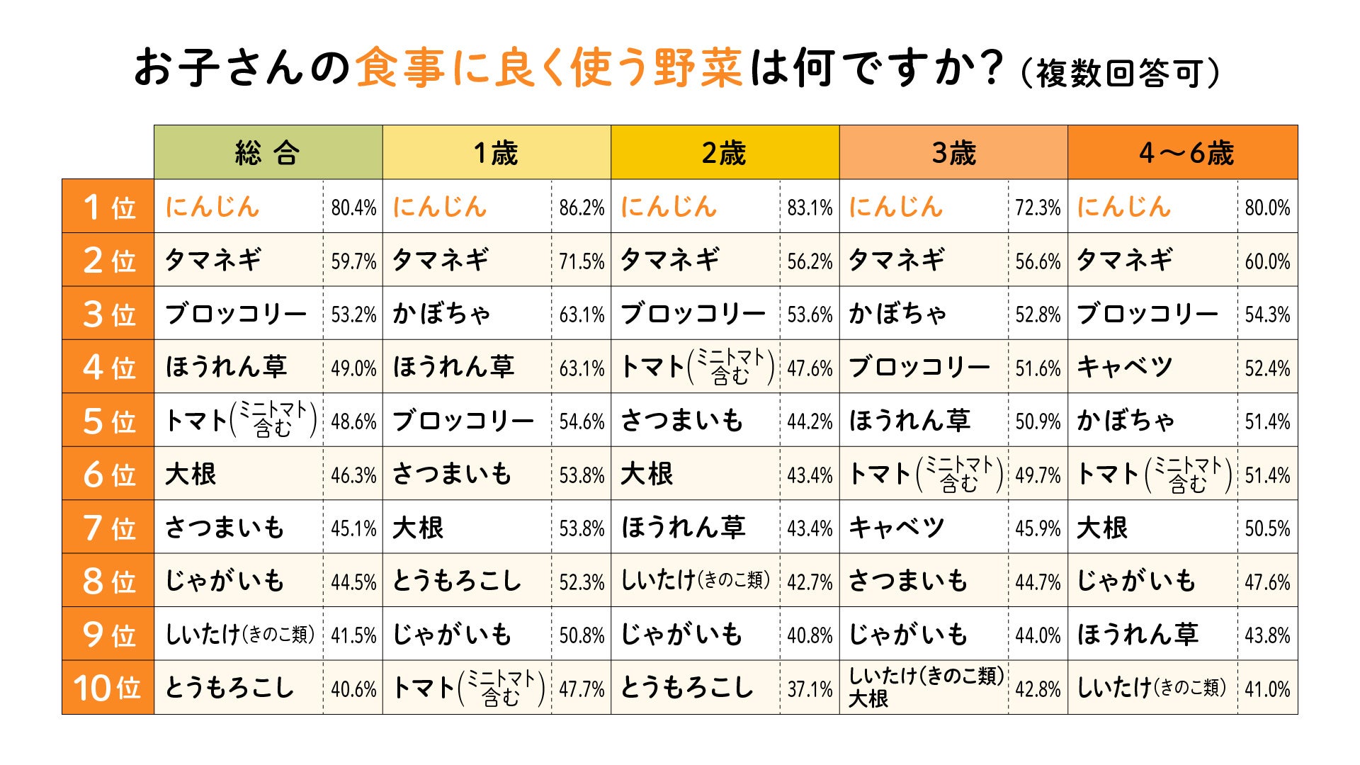 「子どもの食事によく使う野菜『にんじん』『タマネギ』『ブロッコリー』『かぼちゃ』が人気!」