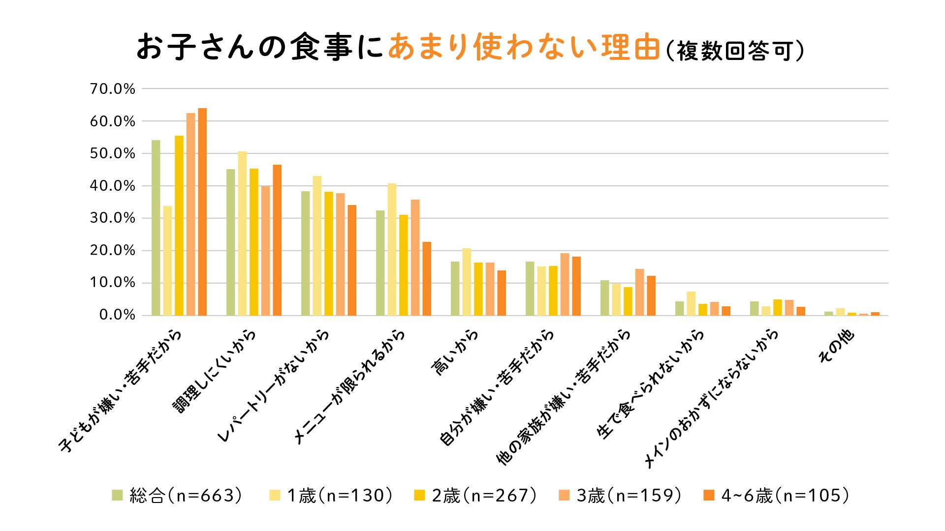 あまり使わない理由として、「子どもが嫌い・苦手だから」「調理しにくいから」「レパートリーがないから」「メニューが限られるから」などが上がりました。