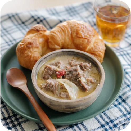 ストゥファートはイタリア語で”シチュー”を意味する家庭料理です。肉の旨味がいきた優しく香るハーブが特徴の自家製ローストパテをキャベツや玉葱、赤ピーマンなどの野菜の自然な甘みとともに味わっていただけます。キャベツは甘みのもとになる糖質が葉菜類の中でも多いのが特徴で煮込むことで充分に甘みが引き出せます。またビタミンUと呼ばれる胃や腸によいビタミンの他、ビタミンCやK、カリウムなどの栄養素も豊富に含まれます。コクのあるイタリアのチーズとメープルシロップの風味を隠し味に野菜もお肉もしっかり食べていただける一品です。