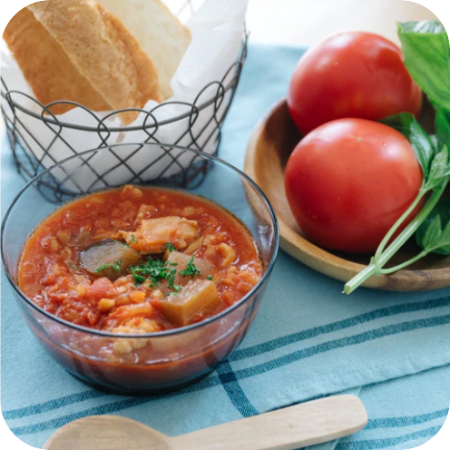 鶏もも肉などに含まれる“コラーゲン”は体を構成するたんぱく質の約3割を占め、人をつくるベースの成分ともいわれるため幼児期にも意識したい栄養素のひとつです。トマトに含まれるビタミンCと一緒にとることで効率よく摂取可能です。食物繊維が豊富なインゲン豆やゴボウ、免疫力アップが期待できるナスやニンジンとともに煮込み栄養満点の1品に仕上げました。鉄分とミネラル豊富な干しブドウを加えたやさしい甘さもおすすめです。