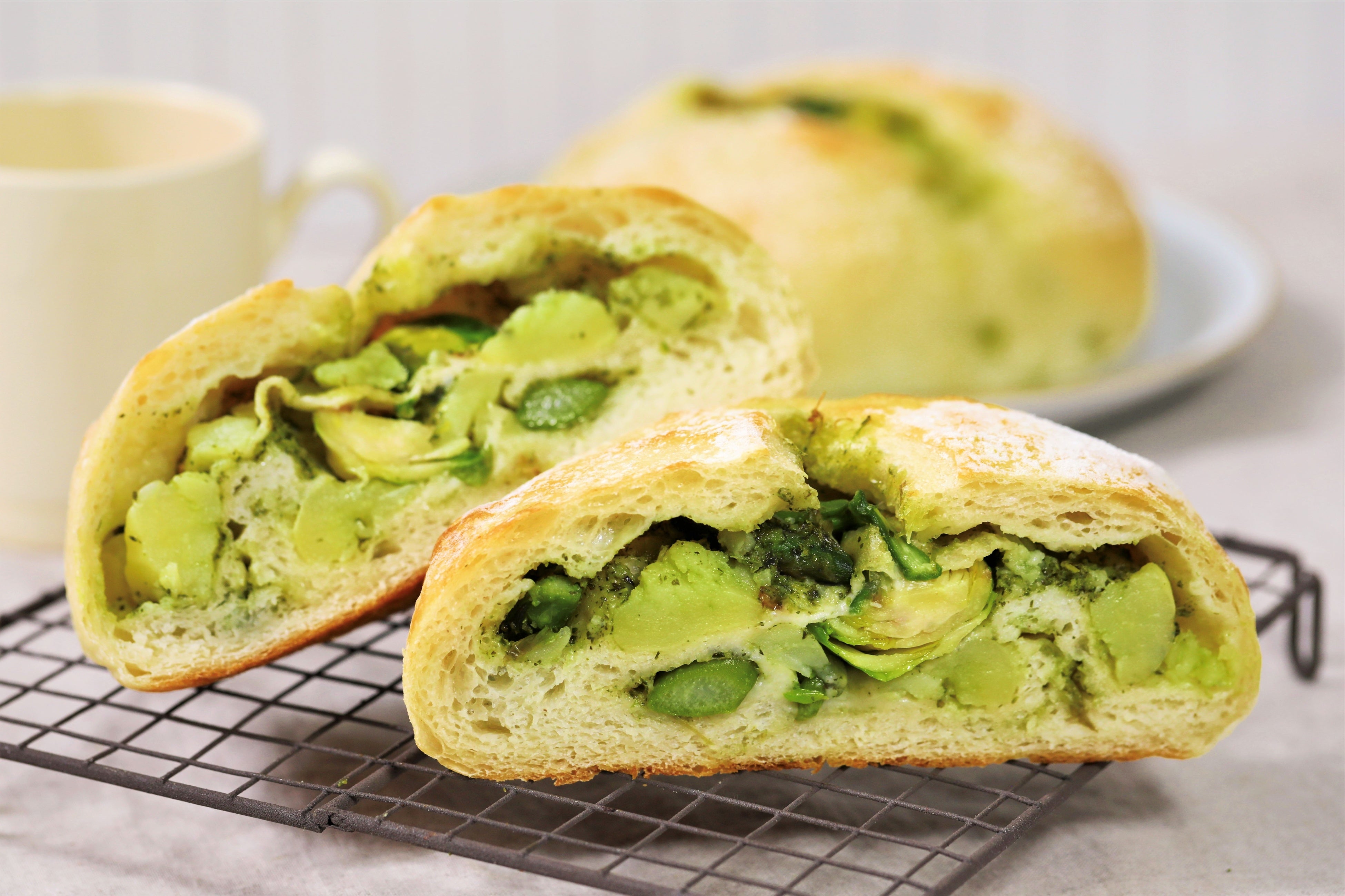 高加水の生地に、じゃがいもと芽キャベツ、アスパラ、バジルペーストを包んで焼き上げました。