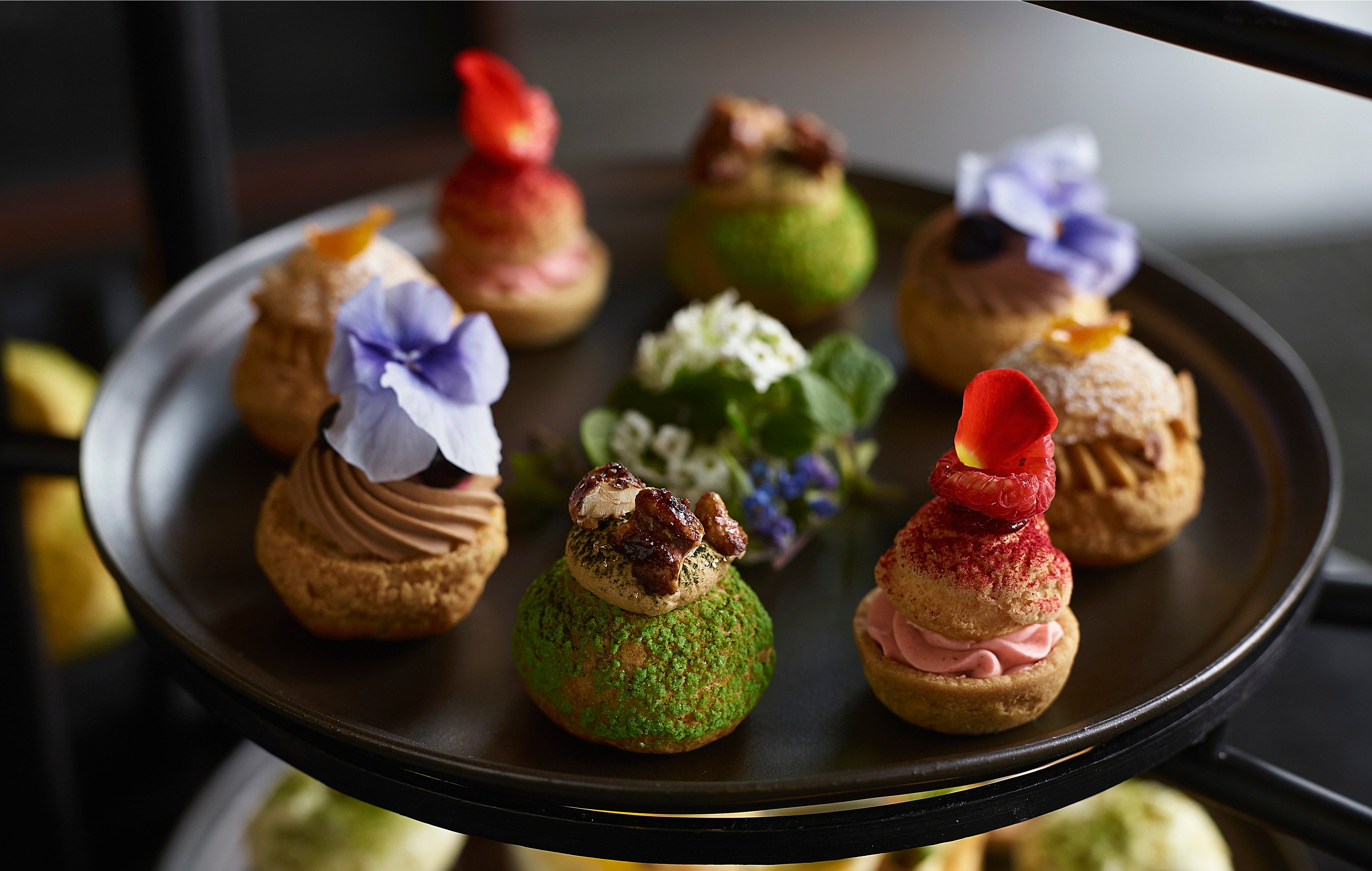 中段では、可憐な花々をあしらったさまざまなフレーバーのプティシューがトレーを彩ります。沖縄産の黒糖と愛媛県産の抹茶を使用した’抹茶シュー’、優しくスミレが香る’シュー ショコラカシス’、ラズベリーとローズを組み合わせた’シュー フランボワーズ’、オレンジ風味のクリームとヘーゼルナッツプラリネのバランスが絶妙な’シュー プラリネオランジュ’の4種です。お口直しのアイスエクレアは、マンゴーまたはピスタチオからお好みのフレーバーをお選びいただけます。