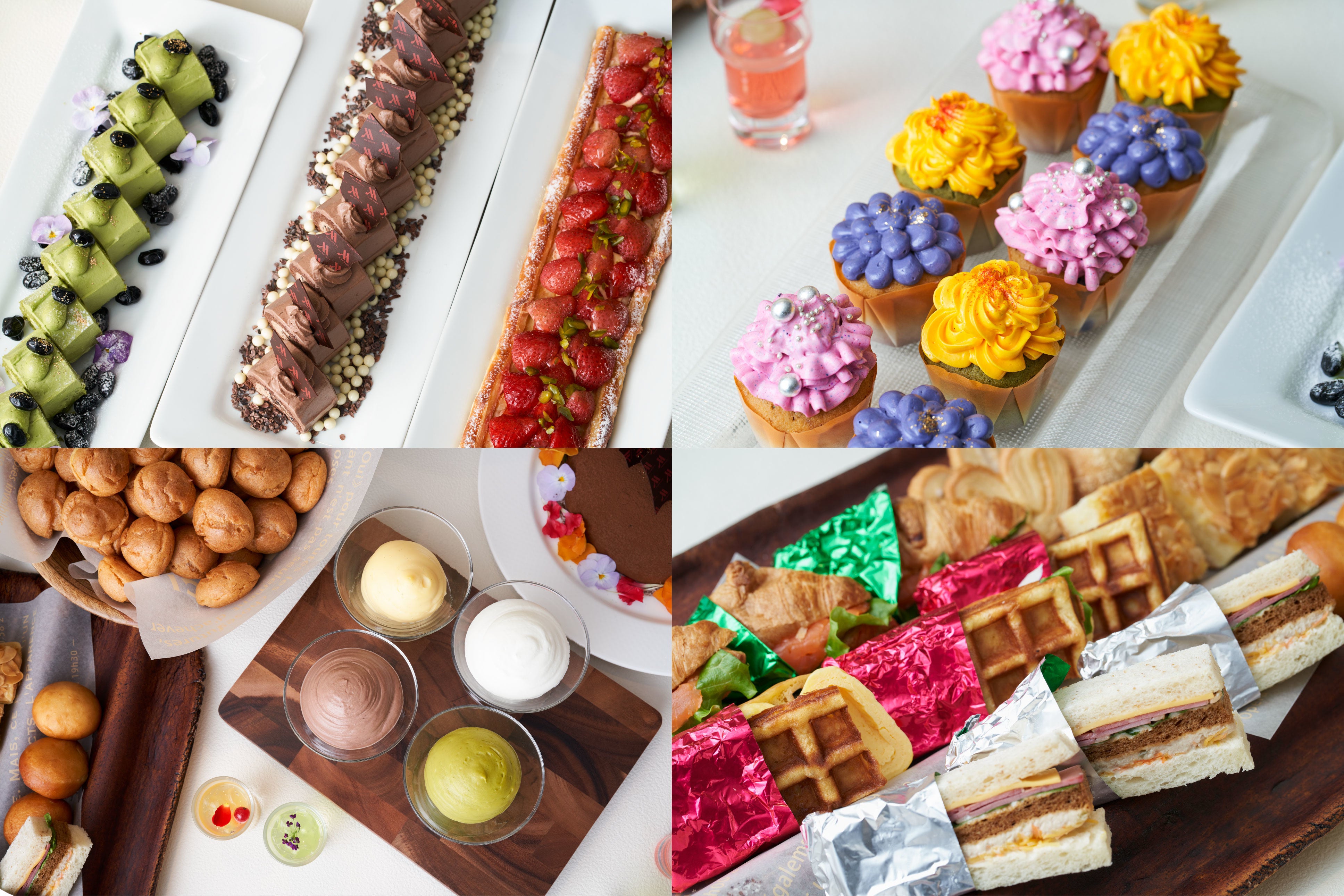 季節ごとにテーマを設けたアフタヌーンティーでこれまで多くのお客様にご好評をいただいてきた東京マリオットホテルのスイーツやブレッド。この度新たな楽しみ方として、お好みのアイテムをお好きなだけお取りいただけるブッフェスタイルでご提供することとなりました。ブッフェステーションには、開業時からのシグニチャーアイテムでもあるネイキッドスタイルのショートケーキのほか、ビビッドカラーで可愛らしい花を模したカップケーキのスイーツから、ホテルで焼き上げたスコーンやチュロスまで、約40種のメニューが並びます。さらにパティシエとベーカーによる季節のスペシャリテとして、搾りたての抹茶モンブランと和三盆でまろやかに仕上げたソフトカステラやドイツの伝統菓子のキルシュクーヘン・マンデルクーヘンをご用意。ホテルメイドのスイーツやブレッドを心ゆくまでお楽しみいただけます。