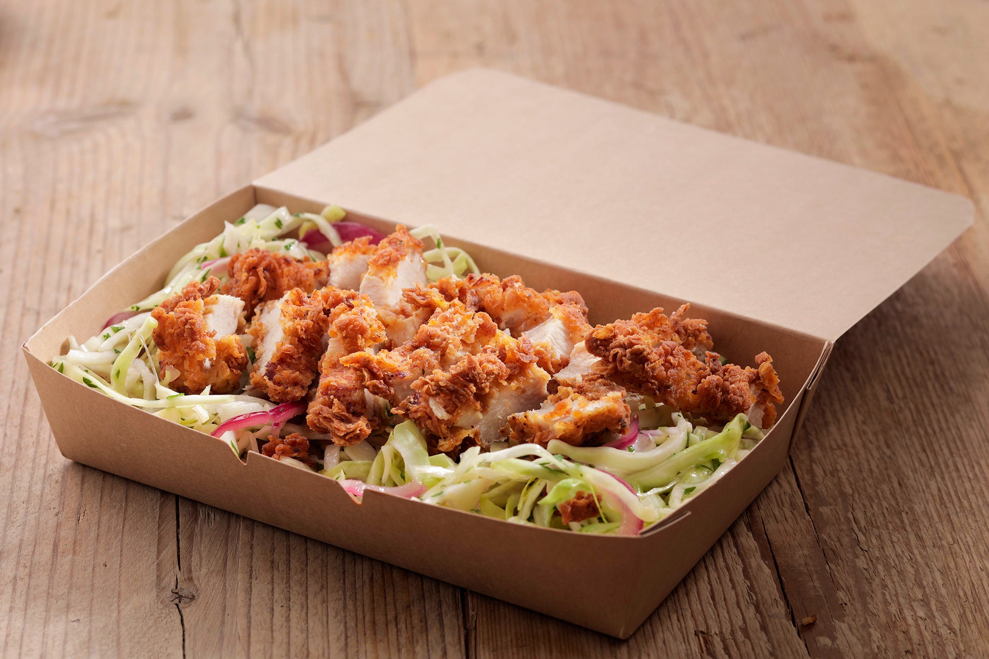 食べやすくカットしたバターミルクフライドチキンとビネグレットキャベツサラダの組み合わせ