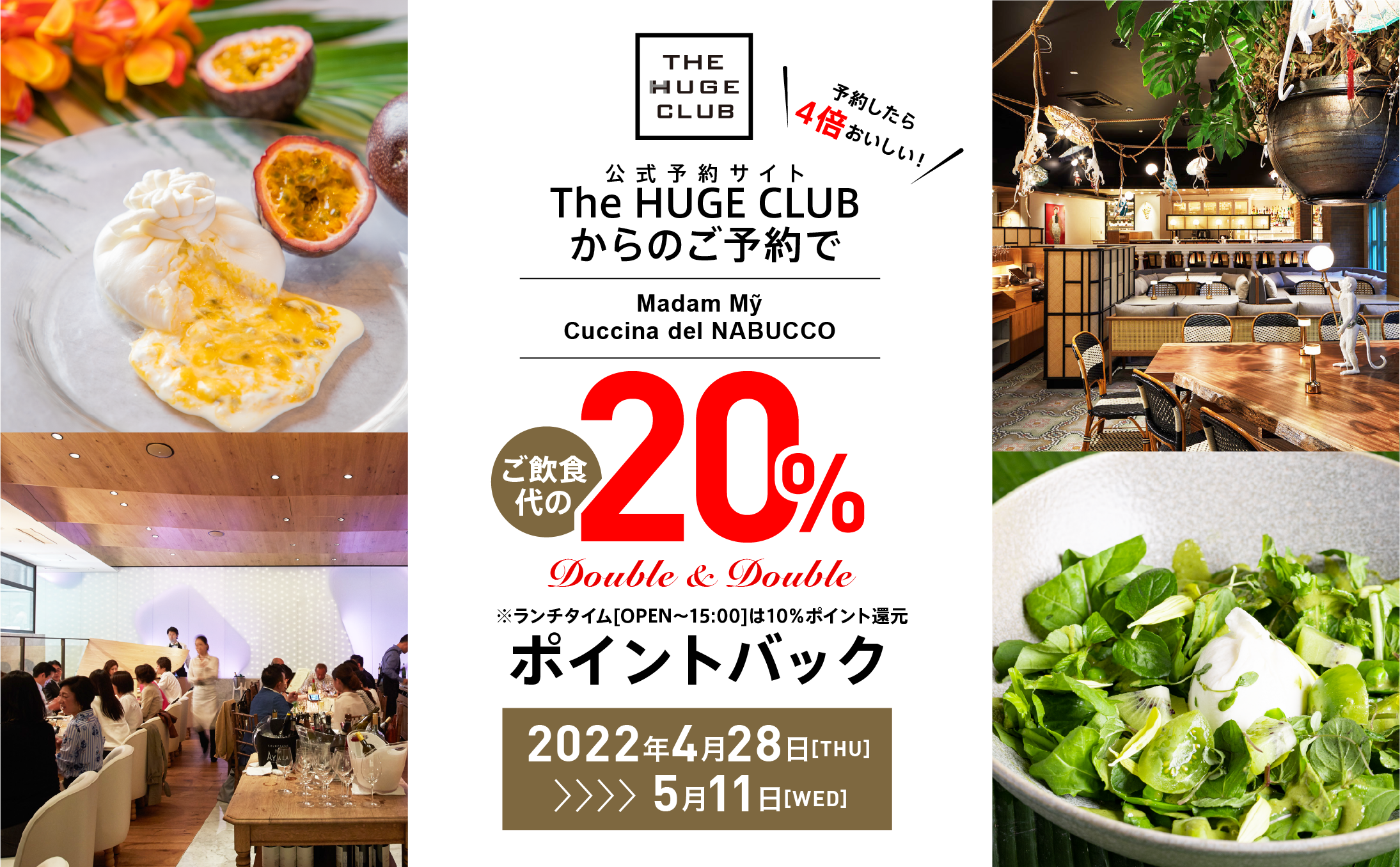 東京・横浜を中心に京都・沖縄など国内に29店舗のレストランを展開する株式会社HUGE(本社:東京都渋谷区、代表取締役社長 兼 CEO:新川 義弘 以下HUGE)は、運営するレストラン「cucina del NABUCCO」(クッチーナ デル ナブッコ)と「Madam Mỹ modern thai Vietnamese」(マダム ミイ モダン タイ ベトナメーゼ)の2店舗にて、HUGE公式予約サイトThe HUGE CLUBの「GWポイントアップキャンペーン」を4月28日~5月11 日までの期間限定で実施いたします。