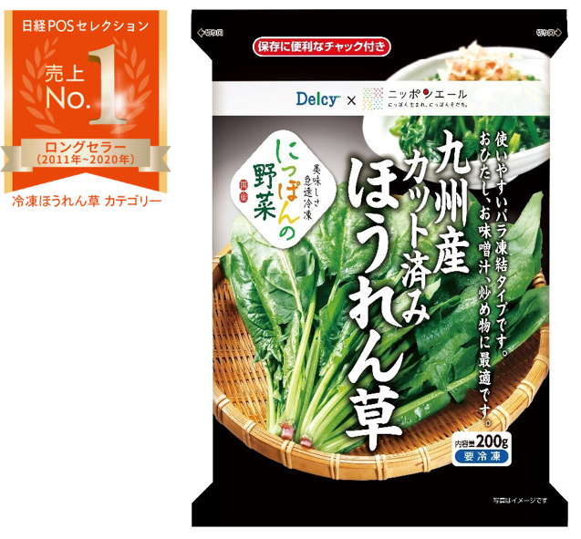 株式会社日本アクセス(所在地:東京都品川区、代表取締役:佐々木淳一、以下:当社)が発売するDelcy「九州産カット済みほうれん草200g」が、日本経済新聞社が発表した「日経POSセレクション2021『ロングセラー』」において、冷凍ほうれん草カテゴリーで売上№1として選出されました。今後も品質管理につとめ、お客様から愛される製品づくりを心掛けてまいります。