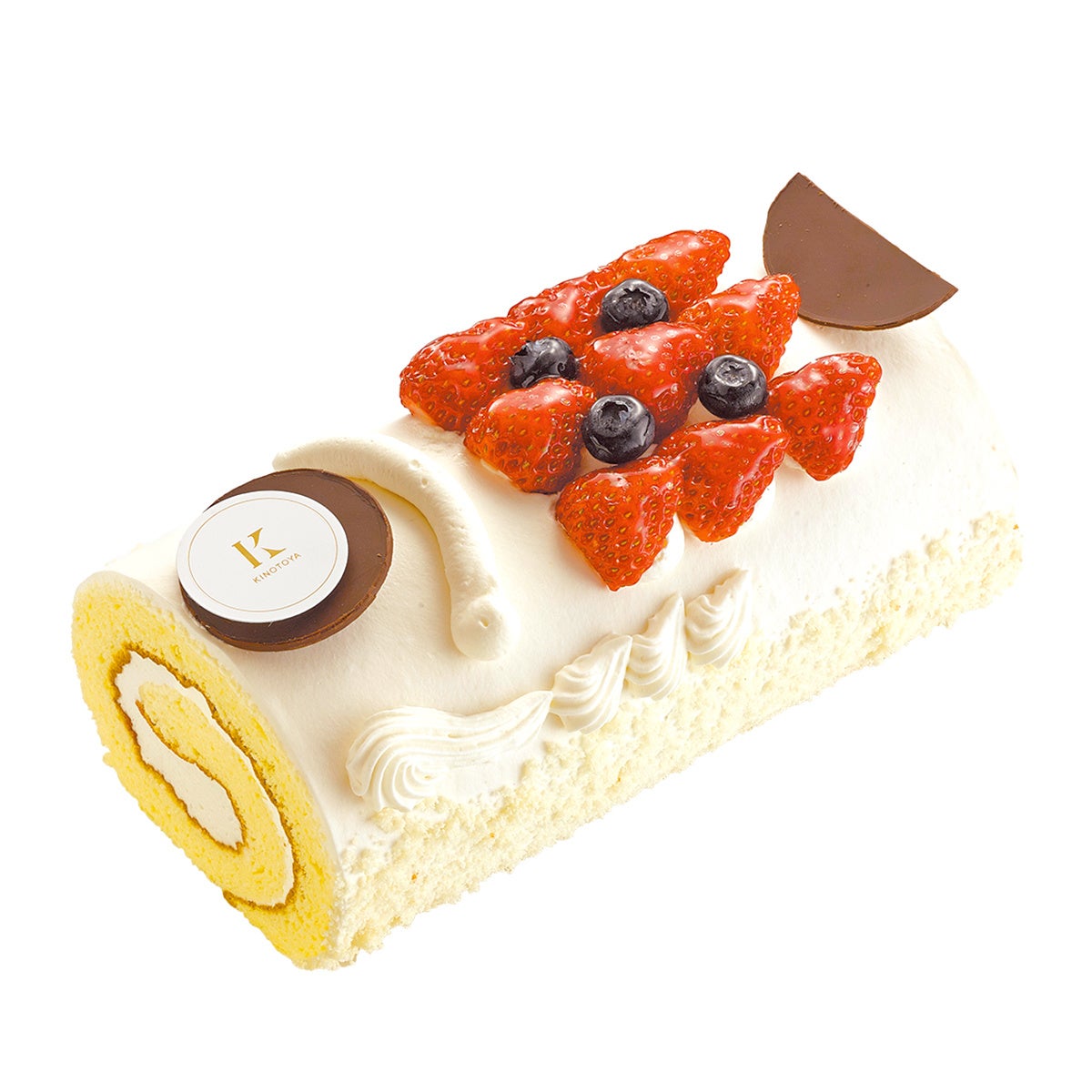 ふわふわなスポンジで生クリームを包み、イチゴとブルーベリー、チョコレートを飾りました。