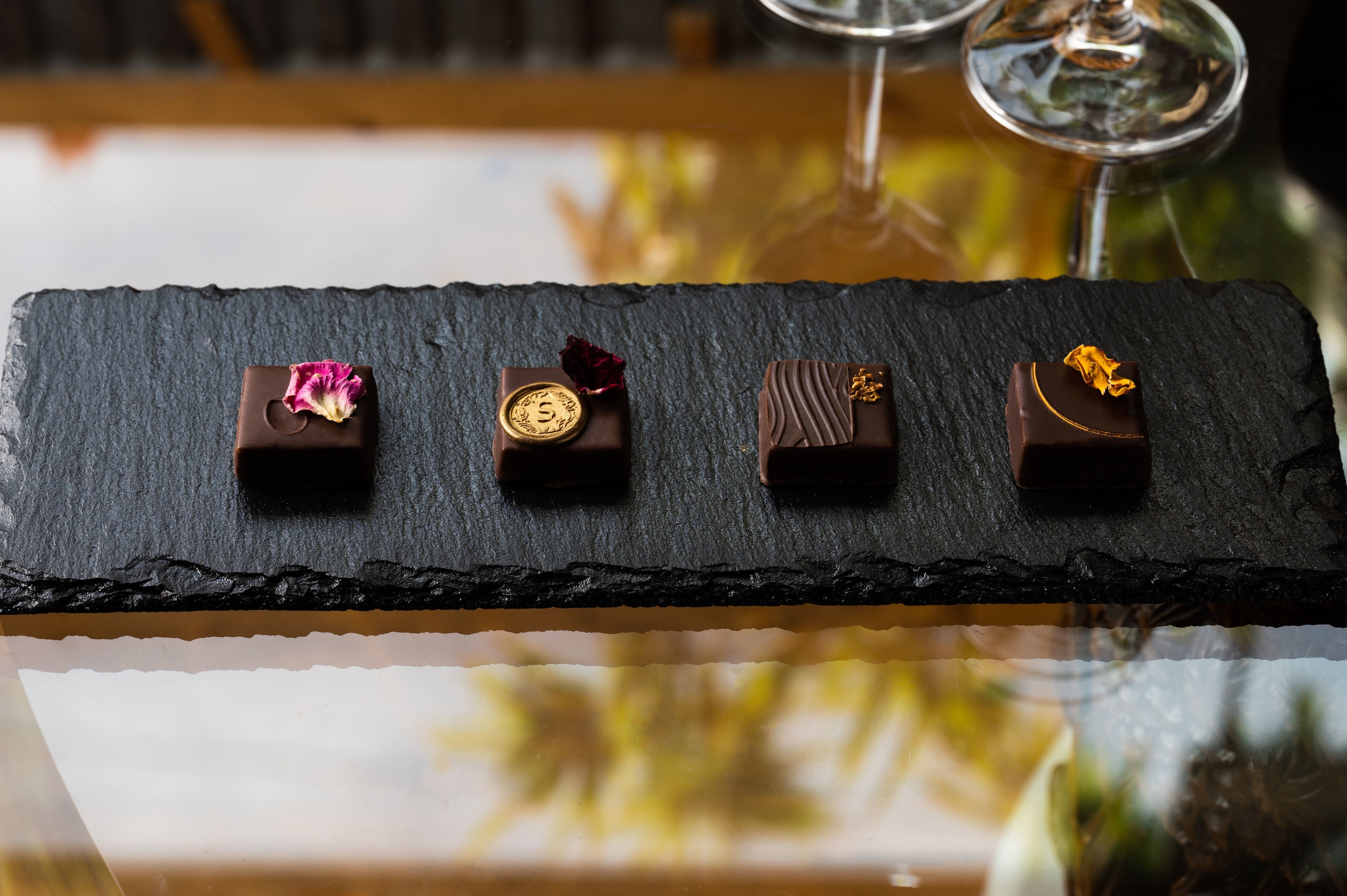『季節のTAKANOMEボンボンショコラ』は、製菓の世界大会で優勝したシェフショコラティエ 瀧島誠士と作り上げた、季節を五感で感じられるボンボンショコラです。パイナップルのような甘みを持つ日本酒“TAKANOME”を、世界各地の厳選したチョコレートで包み込み、エディブルフラワーを使って季節の香りを添えています。