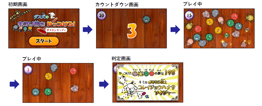 2022年3月に「おそうじ館」に新しく導入したアトラクション「ダス犬(だすけん)のほこり団をやっつけろ!」は、プロジェクションインタラクティブマット※2の技術を使い、床面に映し出される「ホコリ団(ホコリ・ダニ・カビ・カフン)」をダスキンモップを使って30秒間でいくつ消せるかを競うゲームです。消した数に応じて与えられる「称号」は7通り。中には激レアの「称号」もあり、盛り上がる仕組みになっています。参加費は無料で、開館時間中いつでもプレイできます。