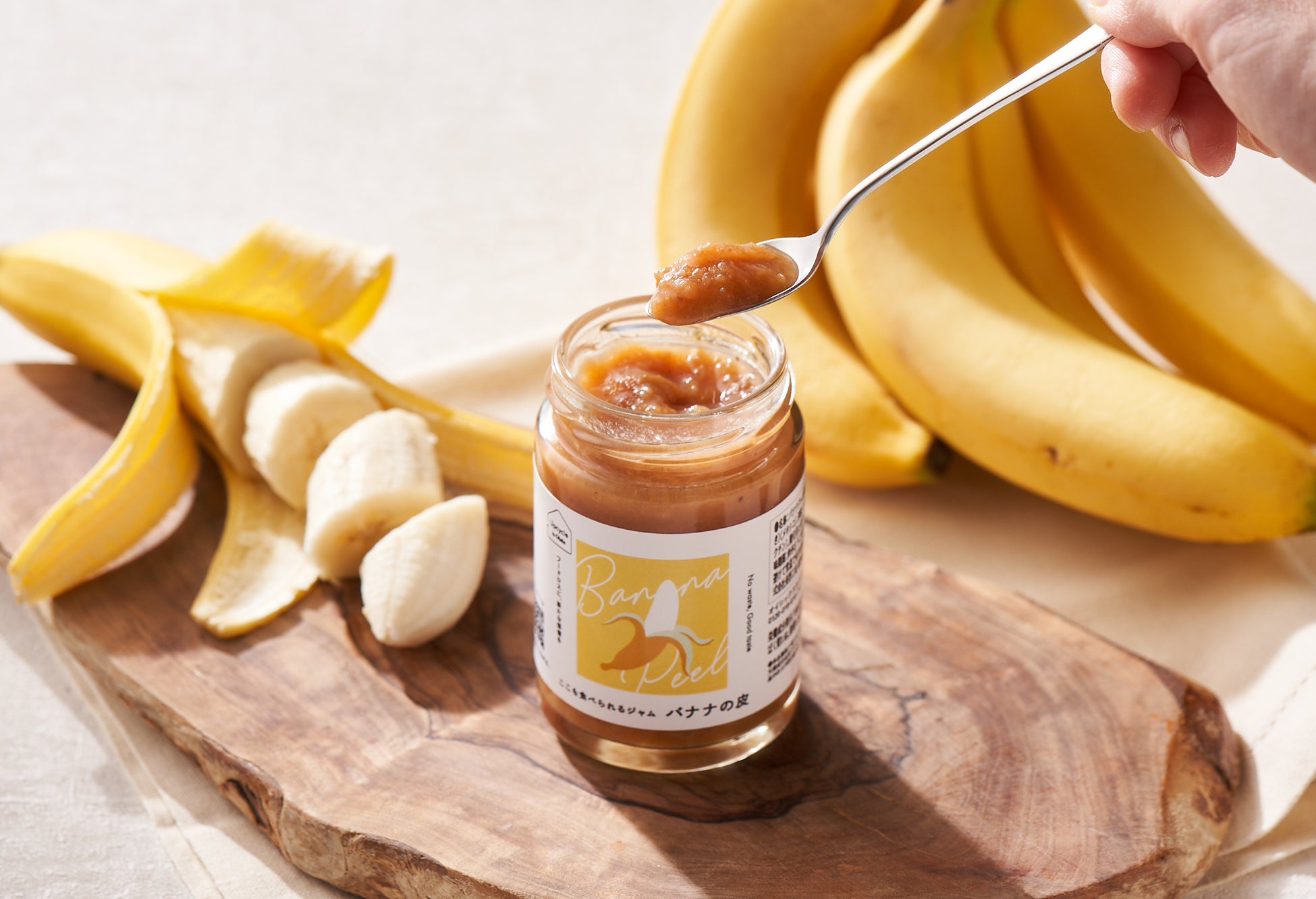 加工時に廃棄されていた有機バナナの皮を、ひと瓶の内容量に対して約20%使用した、おいしく、さわやかな味わいのバナナジャムです。