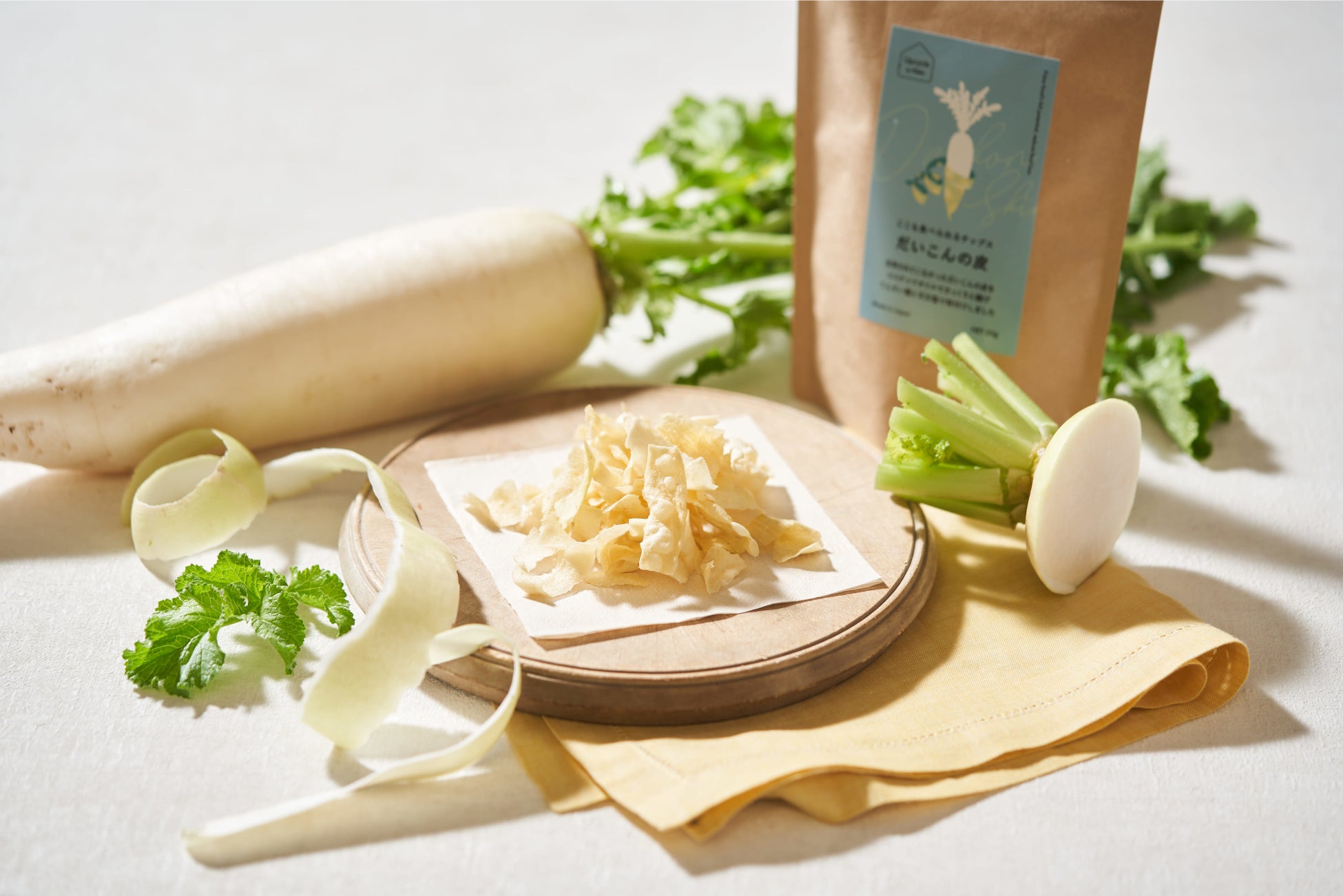 漬物工場から加工時に出る大根の皮を特殊フライヤーで低温フライすることで、パリッとした軽い食感のチップスにしました。 揚げ油はココナッツオイルを使用し、てんさい糖と塩で少し甘めに味付けています。