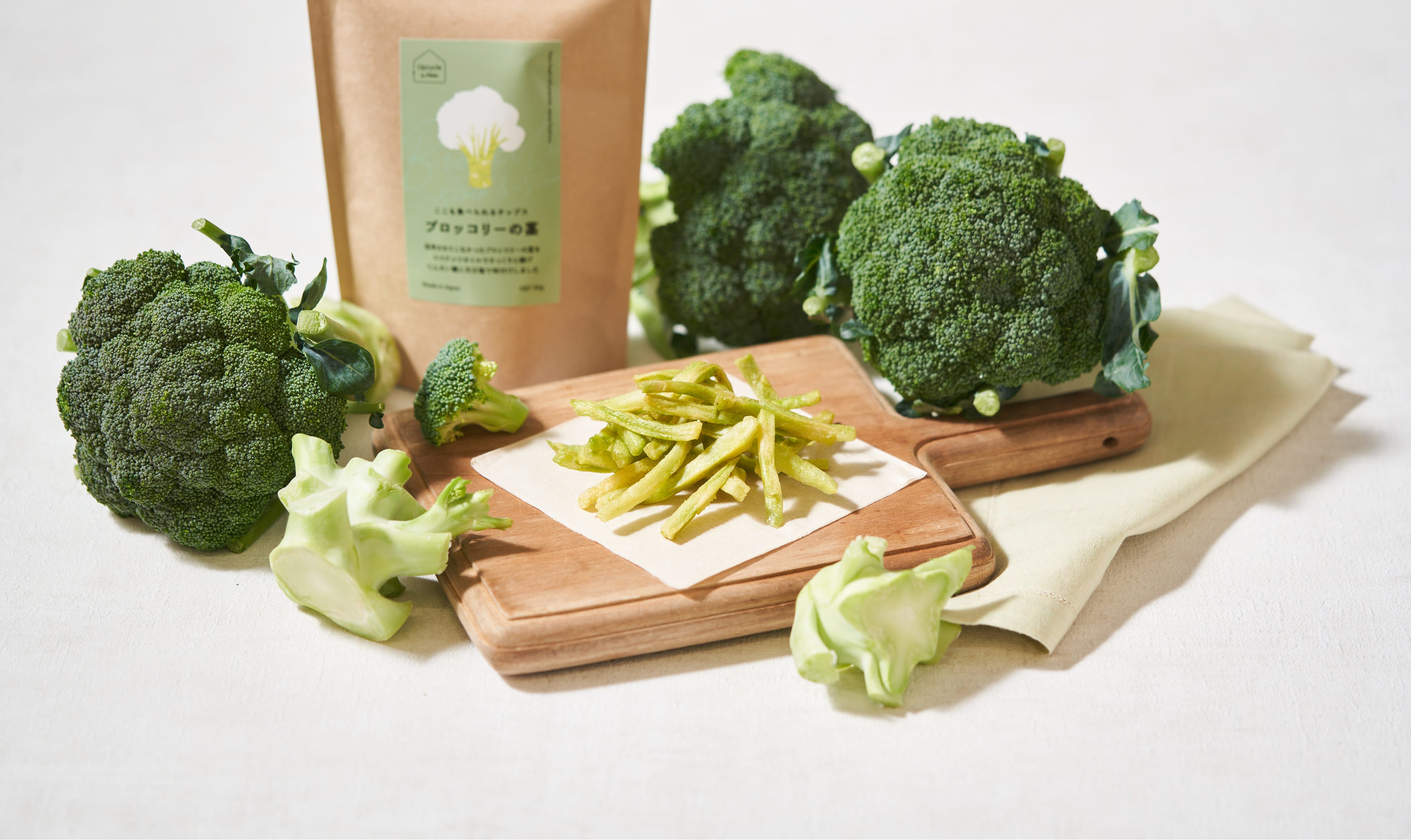 冷凍ブロッコリーのカット工場で花蕾をカットしたあとに残る茎をスティック状にして特殊フライヤーで低温フライすることで、サクサクした軽い食感のチップスにしました。 揚げ油はココナッツオイルを使用し、てんさい糖と塩で少し甘めに味付けています。