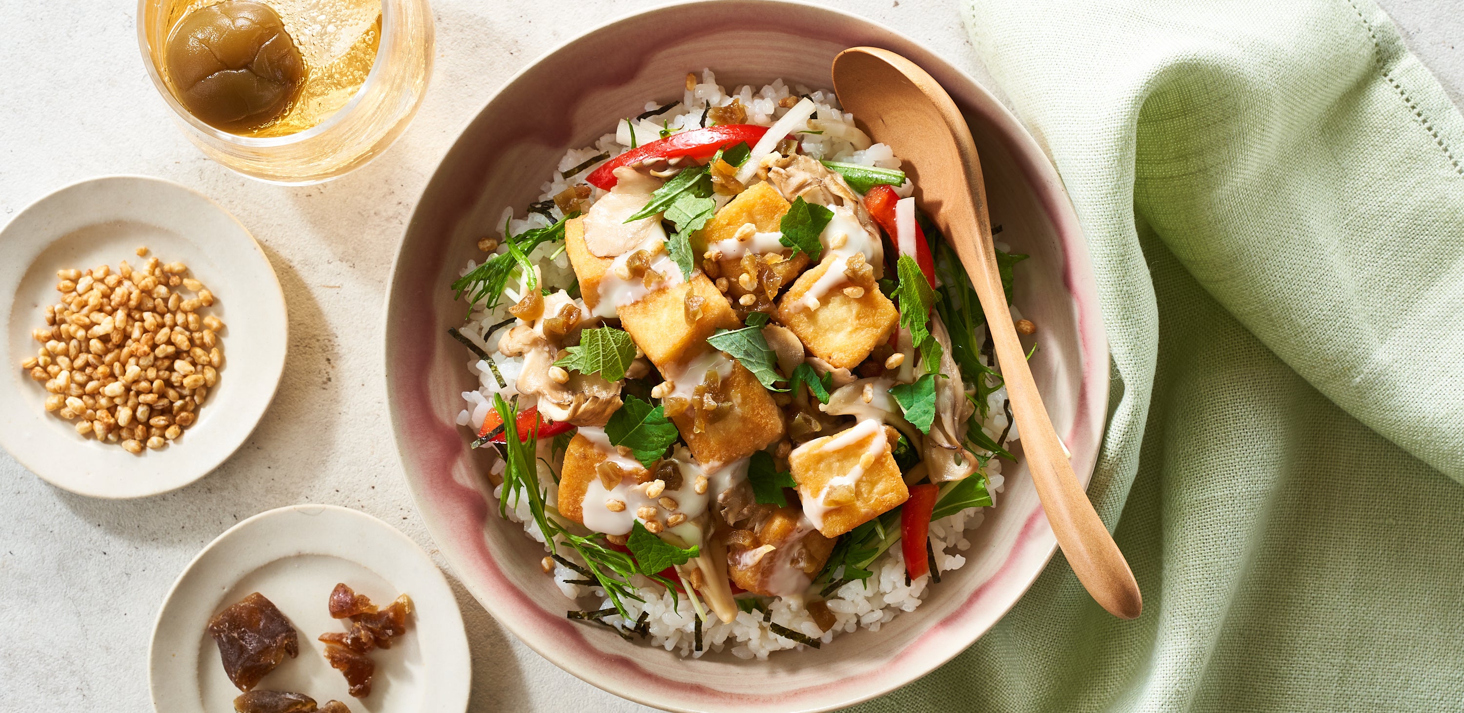 梅酒づくりに使われた梅はおいしく食べられる食材ですが、加工の難しさなどから利用される機会がほとんどありませんでした。にんにく醤油味で食べる、シャキシャキした生野菜とこんがり厚揚げのどんぶりに、ドライフルーツにした梅を梅酢と合わせることで、しっとりとした食感とやさしい梅の香りにまろやかな塩気が感じられ、野菜もごはんもお箸がすすむ味わいに仕上げました。地球にもからだにもやさしい、ヴィーガンのミールキットメニューです。