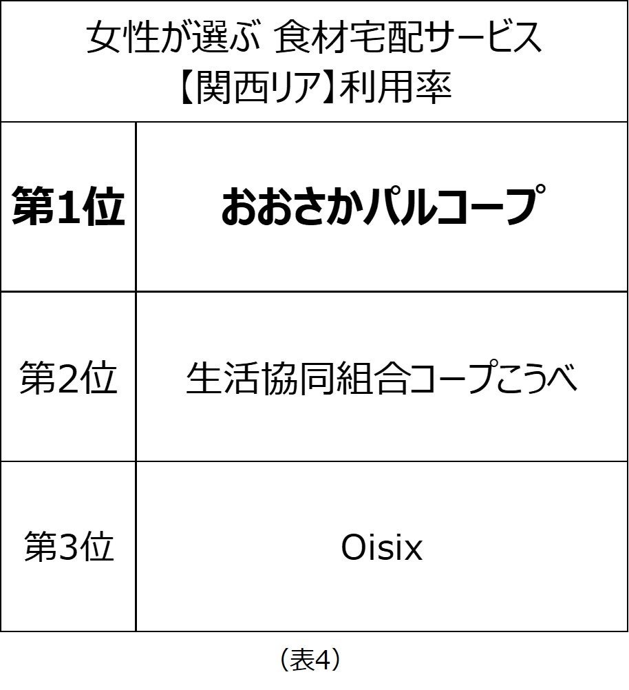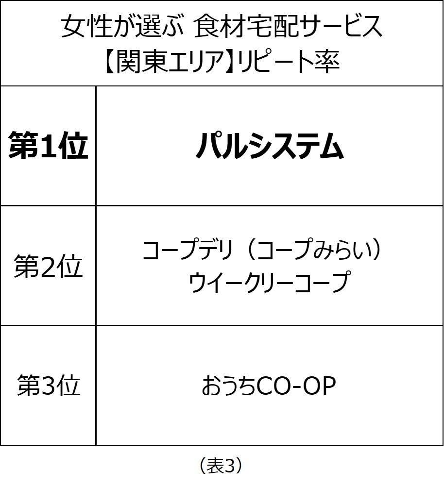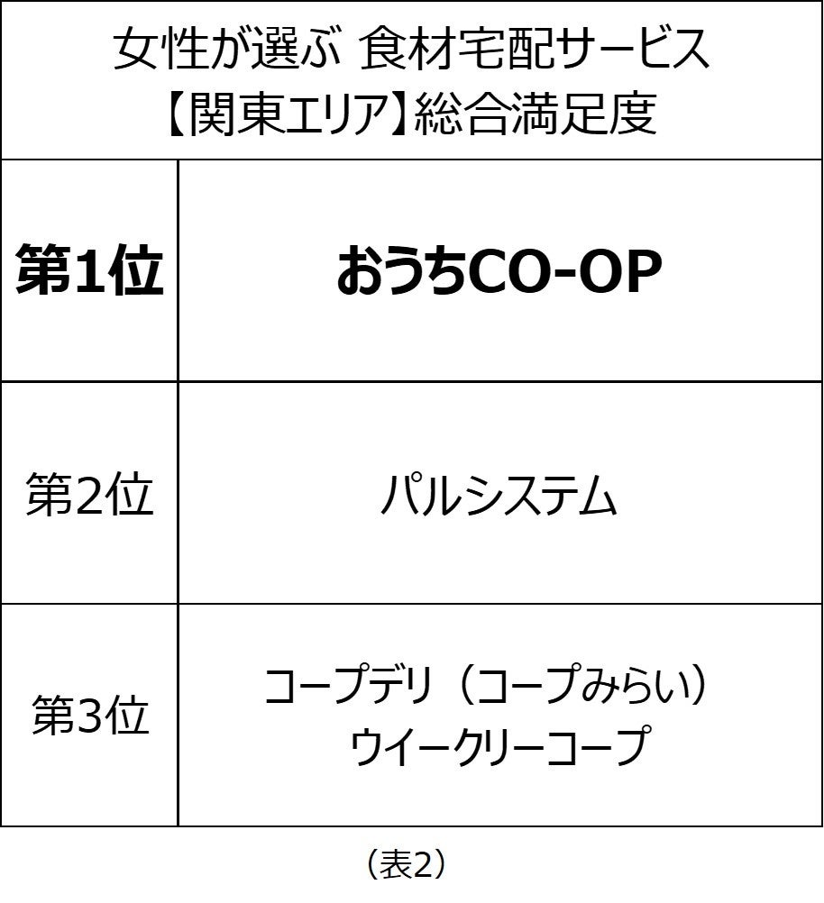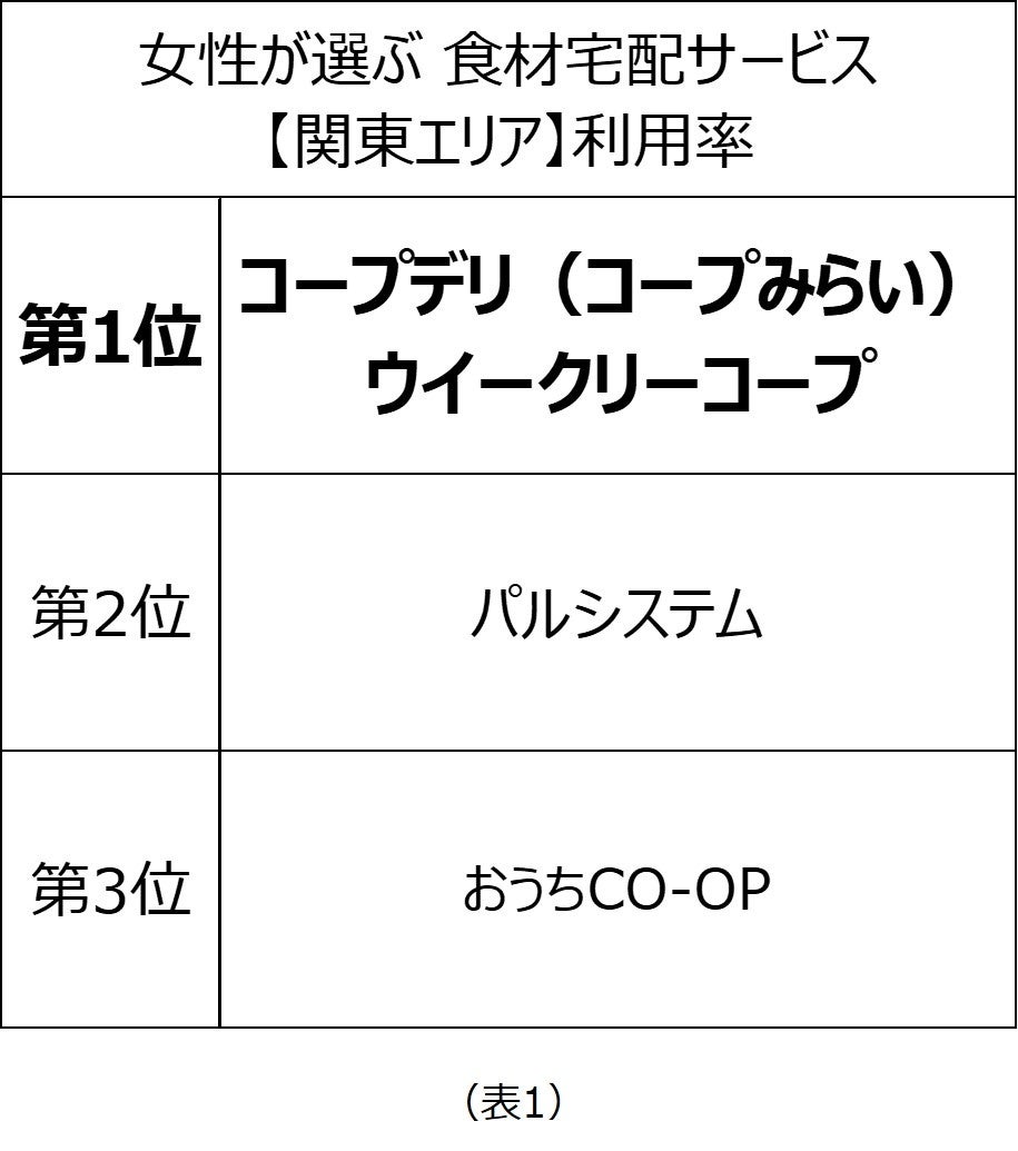 2022年2月に実施した調査において、関東エリアでは「コープデリ(コープみらい)ウイークリーコープ」が利用率第1位、「おうちCO-OP」が総合満足度第1位、「パルシステム」がリピート率第1位となりました(表1~3)。関西エリアでは「おおさかパルコープ」が利用率第1位に(表4)。また、関東・関西エリアのミールキット評価では「Oisix」が第1位となりました(表5)。