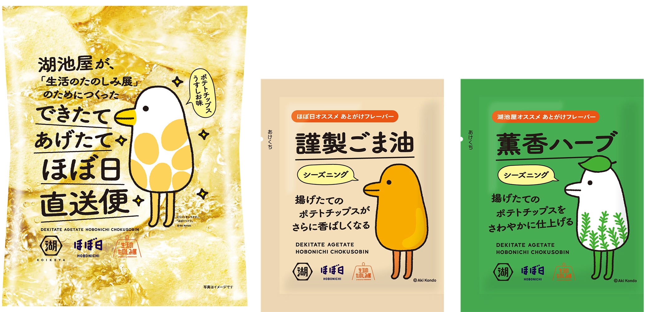 そして、今回のイベントのために、「ほぼ日」とともに企画・開発した商品が「できたてあげたてほぼ日直送便」です。イベントの数日前に揚げたばかりのできたて新鮮、日本産100%のポテトチップス(うすしお味)を、ほぼ日オリジナルパッケージでお届けします。さらに、揚げたてのポテトチップスがさらに香ばしくなる「謹製ごま油」、揚げたてのポテトチップスをさわやかに仕上げる「薫香ハーブ」の、後がけして美味しい2種のパウダーもセットにし、味変も楽しんでいただける商品となっています。