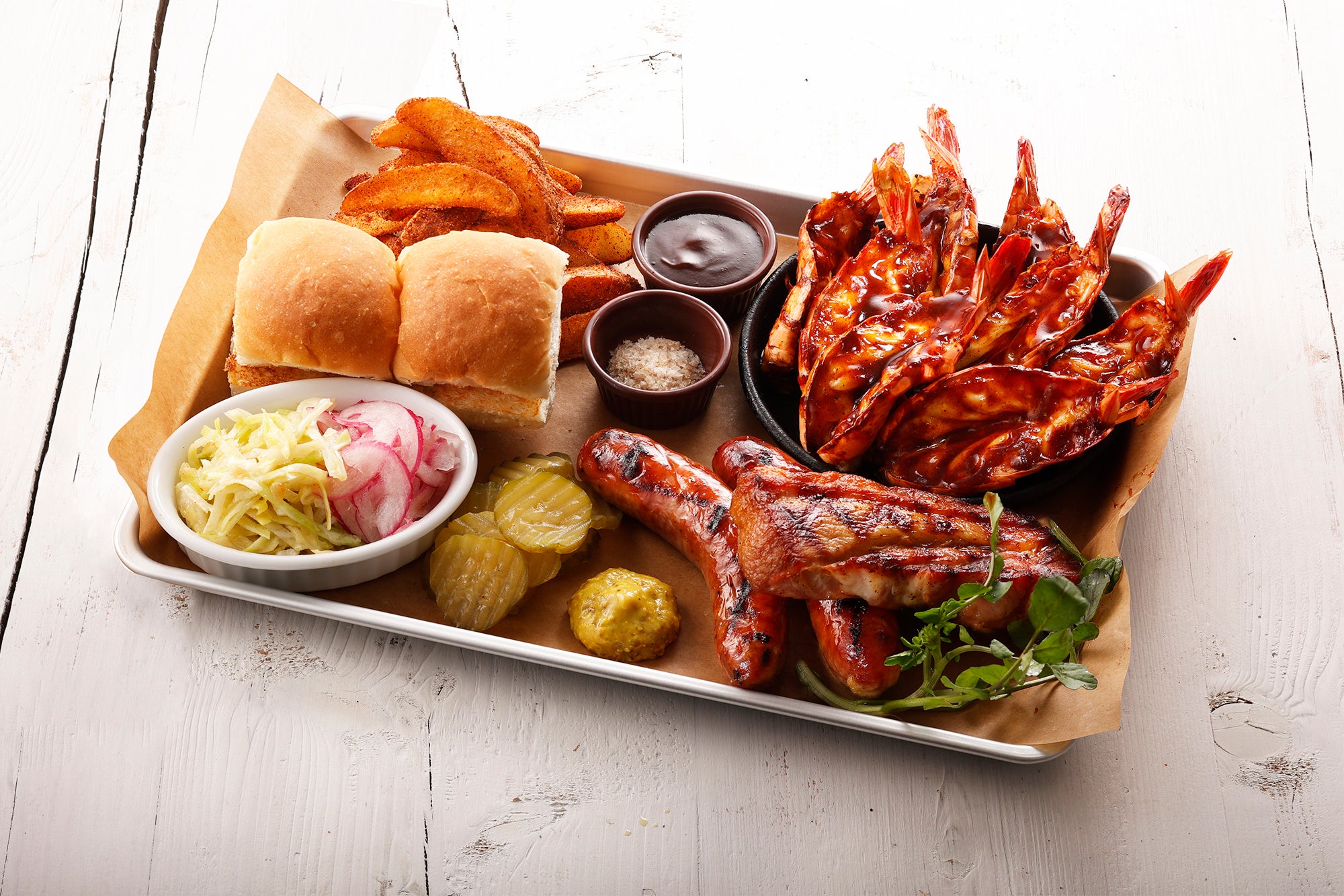 シュリンプをこんがりとグリルした後に、スモーキーなBBQソースを塗って仕上げました。コールスローとご一緒に、セットのバンズでサンドして召し上がるのがおすすめです。付け合せのポテトはケイジャンパウダーでスパイシーに仕上げました。