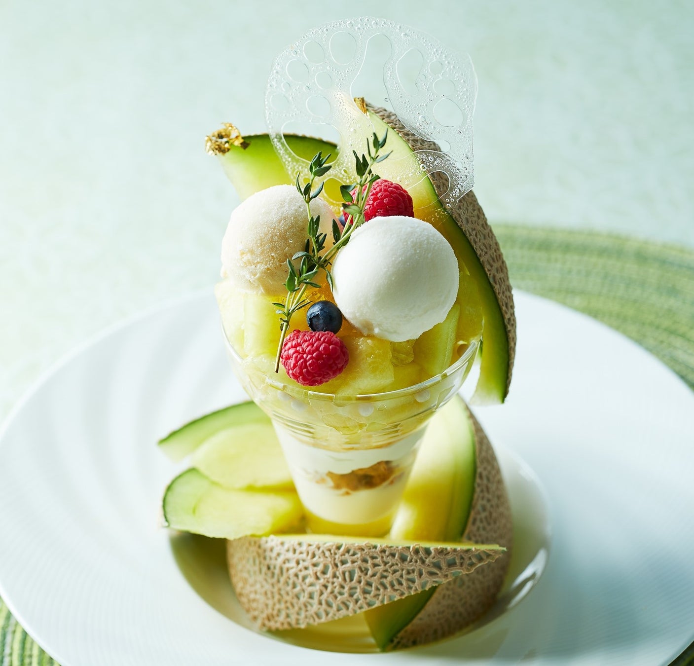 パフェは、果物の王様 マスクメロン半玉分を使い、ココナッツのパンナコッタやクッキー、スポンジ生地、アイスクリームを盛りだくさんにデコレーションした、メロン好き、パフェ好きの方必見の、清々しいこの時季のプチ贅沢に最適な一品です。