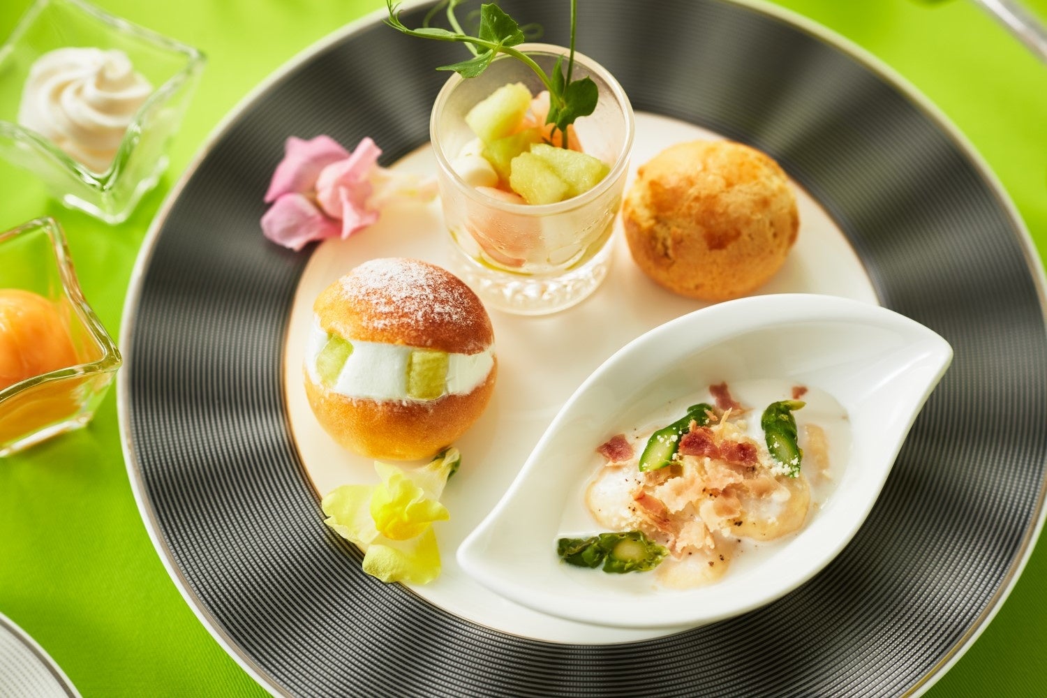 新緑がみずみずしく輝くイチョウ並木に臨むティーラウンジに、初夏の訪れを告げるメロンのアフタヌーンティーセット、パフェが登場します。アフタヌーンティーセットは、クッキーとアーモンド生地の上にのせたかわいい「メロンのムース」、王道の「メロンショートケーキ」などのスイーツと、モッツァレラチーズとビネガー、オリーブオイル、バジルが効いた「メロンと海老のカクテルサラダ」などのセイヴォリーをお楽しみいただきます。