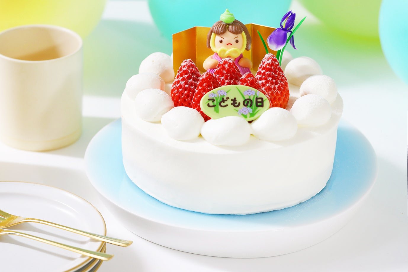 ふわふわのスポンジに苺をサンドし、苺とホイップクリームで仕上げた王道な苺のデコレーションケーキの上には兜をかぶった可愛らしい男の子と金屏風、そして災いとなる邪気を払い、子どもたちの健康を願うといわれている菖蒲の花を飾りました。