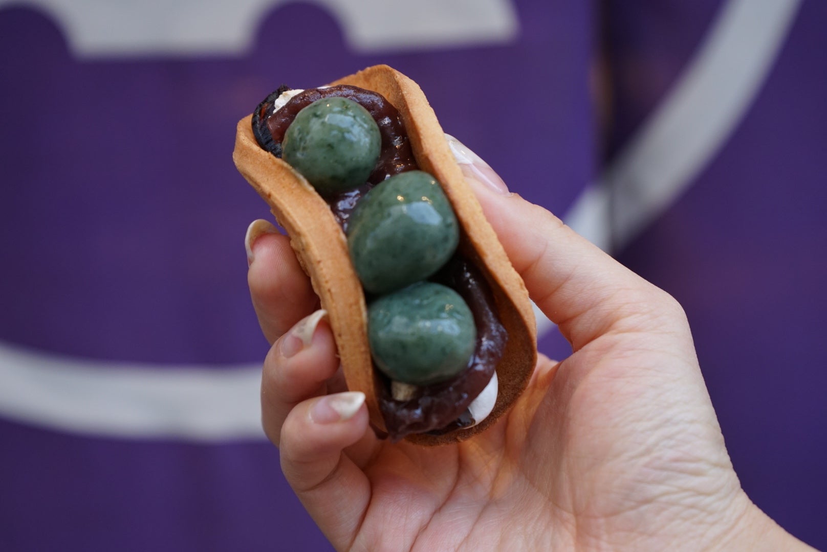 やわらかい瓦せんべいのベースに生クリーム・黒蜜寒天・きなこクリーム・よもぎ団子をのせた和風スイーツ。ほんのり甘い自家製の黒蜜寒天ときなこクリームは相性抜群!ぎんざ空也 空いろのこだわりのあんこもたっぷりと。様々な食感が楽しめるワンハンドスイーツです。