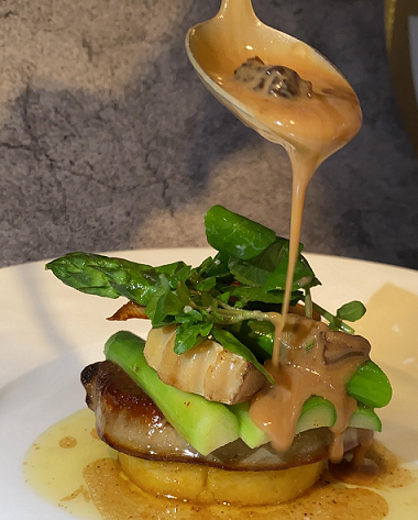 トウモロコシの粉から作るポレンタの優しい甘み、フォアグラのコク、筍の香ばしさと食感が最高にマッチした一皿。筍は今が旬の新鮮な地元産を使用、また国産アスパラガスもたっぷりとのせました。ポール・ボキューズらしい香り高いマデラ風味のモリーユ茸のソースは、テーブルで召し上がる直前にお客様の目の前でサービスします。