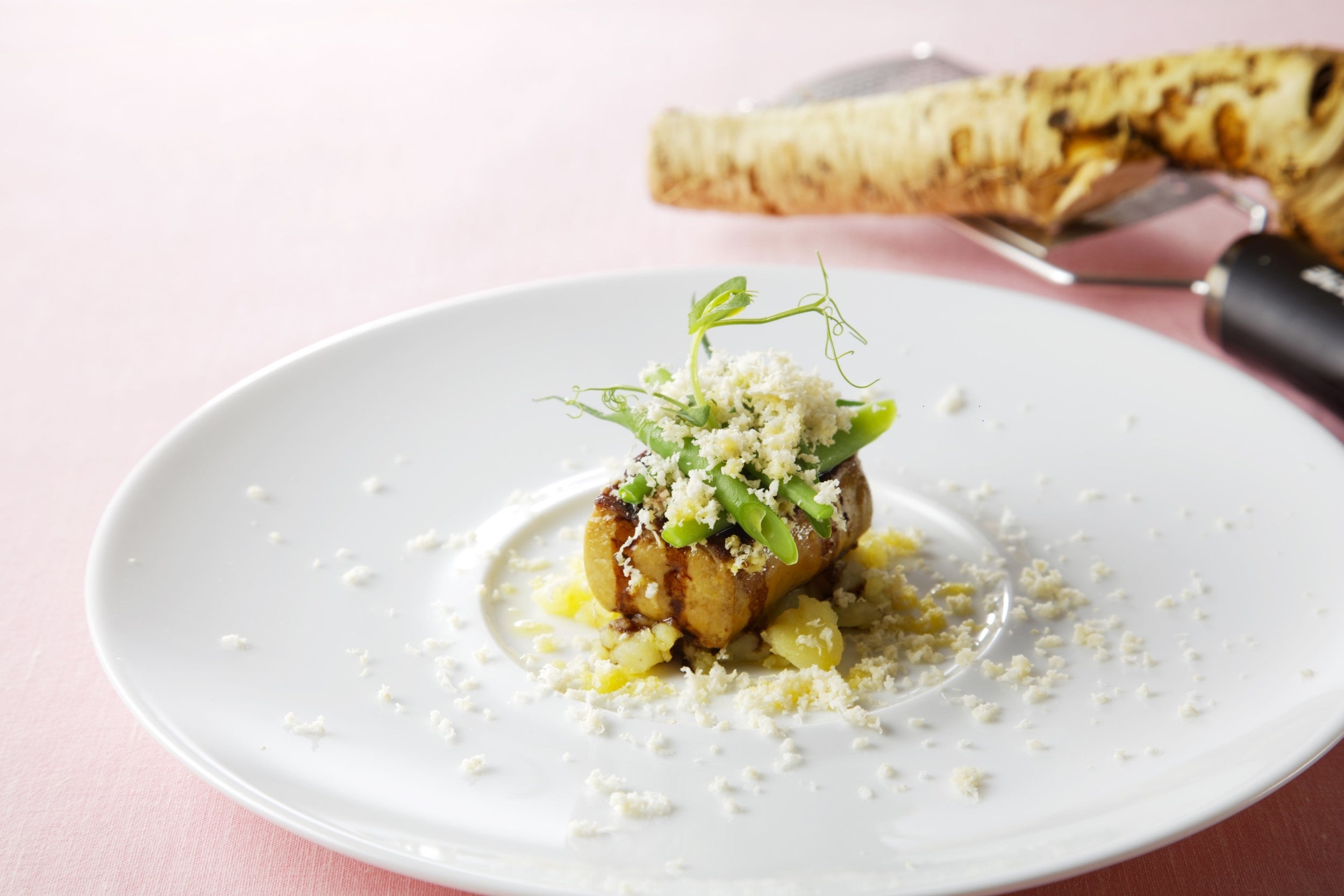 雪に見立てたさわやかな香りと辛みを持つ北海道産の山わさび、フォアグラの上にのせたインゲン豆の鮮やかな緑は、“春の芽吹き”をイメージしています。バルサミコビネガーを煮詰めた甘酸っぱいソースを合わせ、野菜はすべて地元産を使いました。仏×北海道のマリアージュを楽しみつつ、春を感じていただけるフォアグラの一皿です。